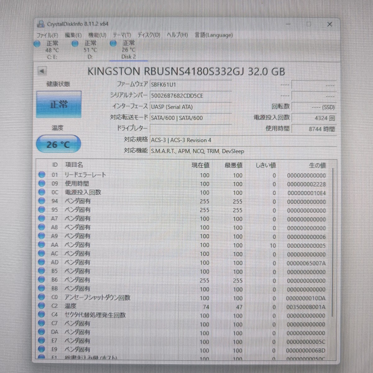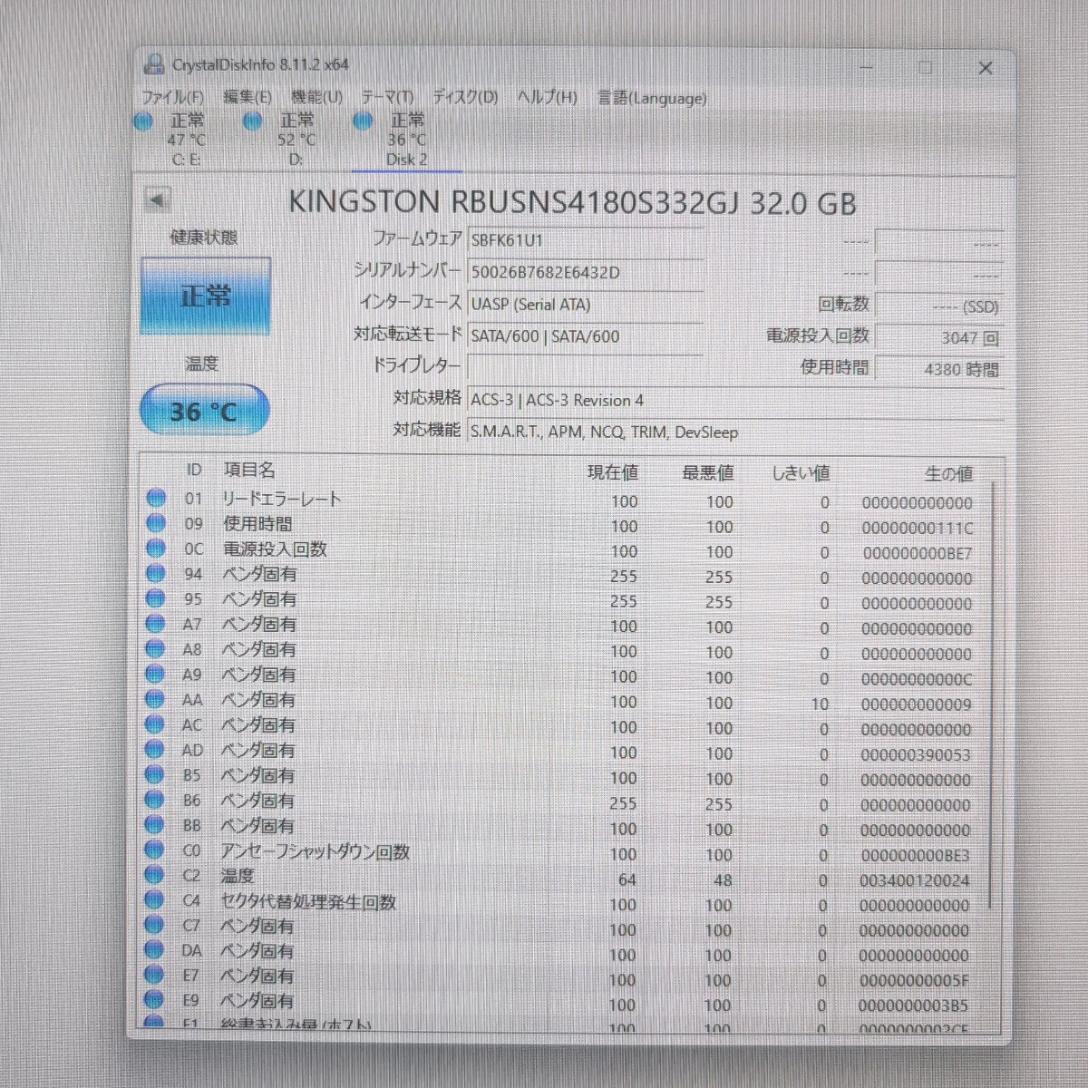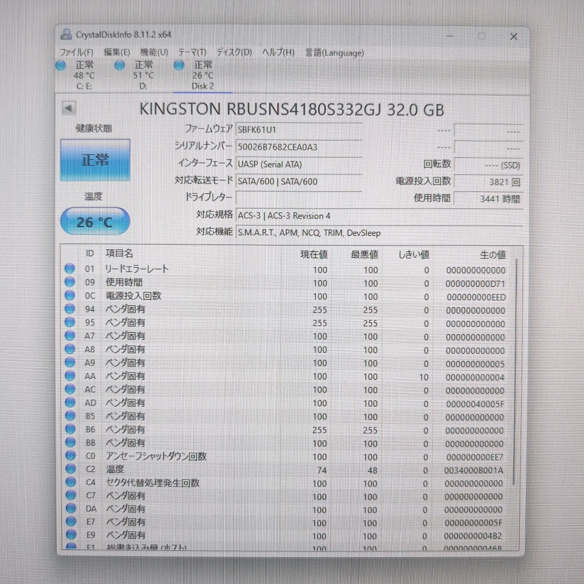 | 注意事項 | ■配送業者のご指定は契約上、承ることが出来ません。 ■土日はお休みを頂いており、週明けでの対応となります。 ■まとめて取引にご承諾頂けない場合、単品での発送となりますのでご注意ください。 ■保証類は設けておりません。返品不可のお品物です。 ■CrystalDiskInfoはあくまで目安であり、快適な動作を保証するソフトではございません。 ■このページに記載がない不良は保証外となります。 ■商品の使用方法などの電話・サポートは一切致しかねます。 ■梱包、清掃は簡易となります。 ■あくまでも中古品ですのでご了承いただけますようお願い申し上げます。 ■梱包済み商品となりますので、同梱を承ることができません。 以上、よくお読みになって質問・入札願います |