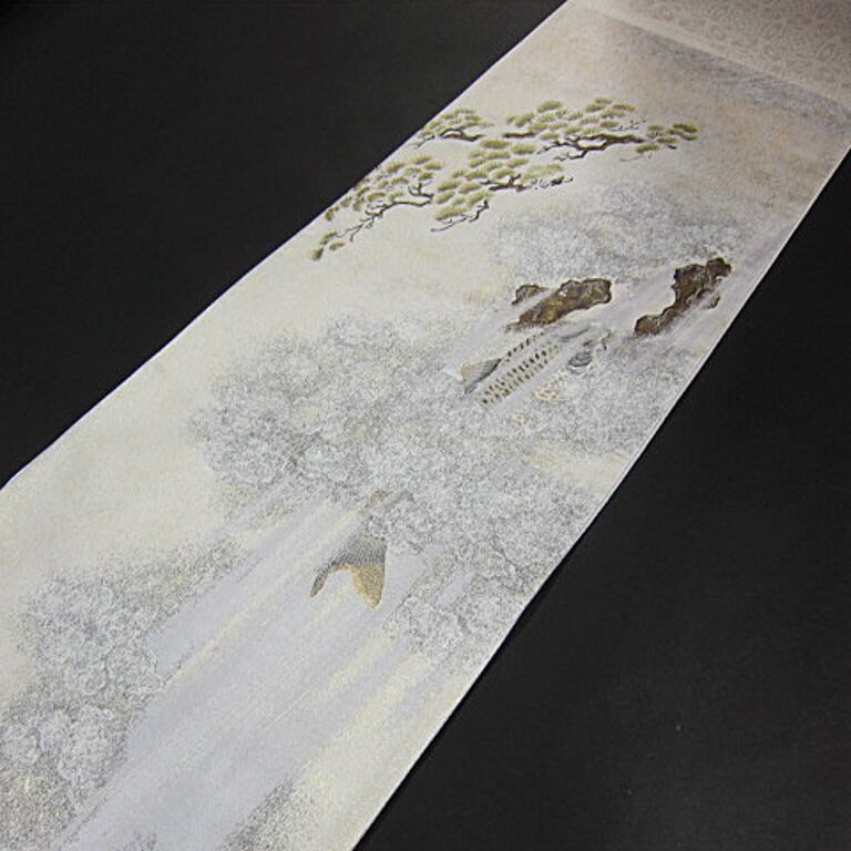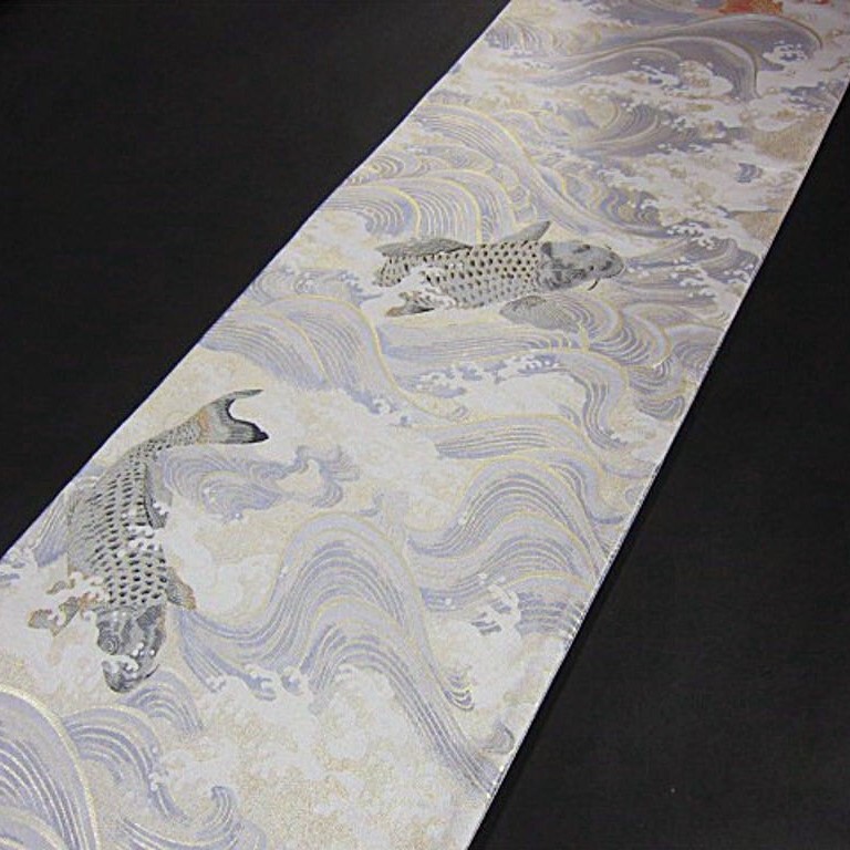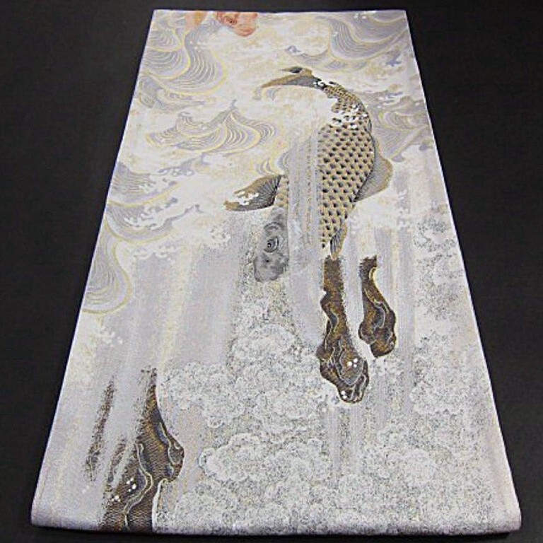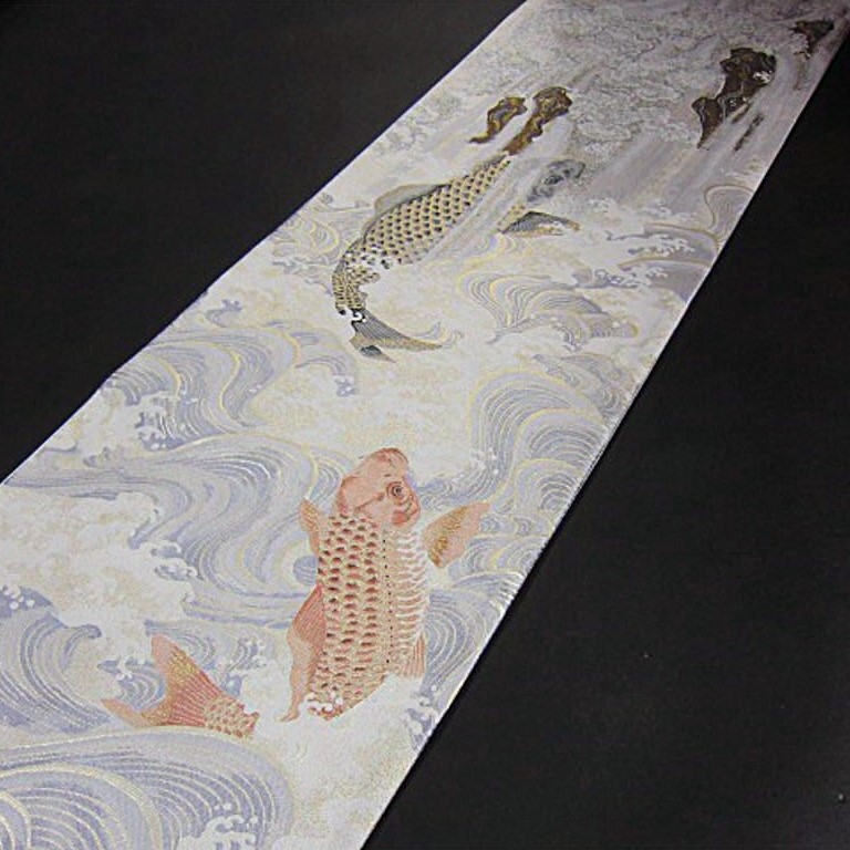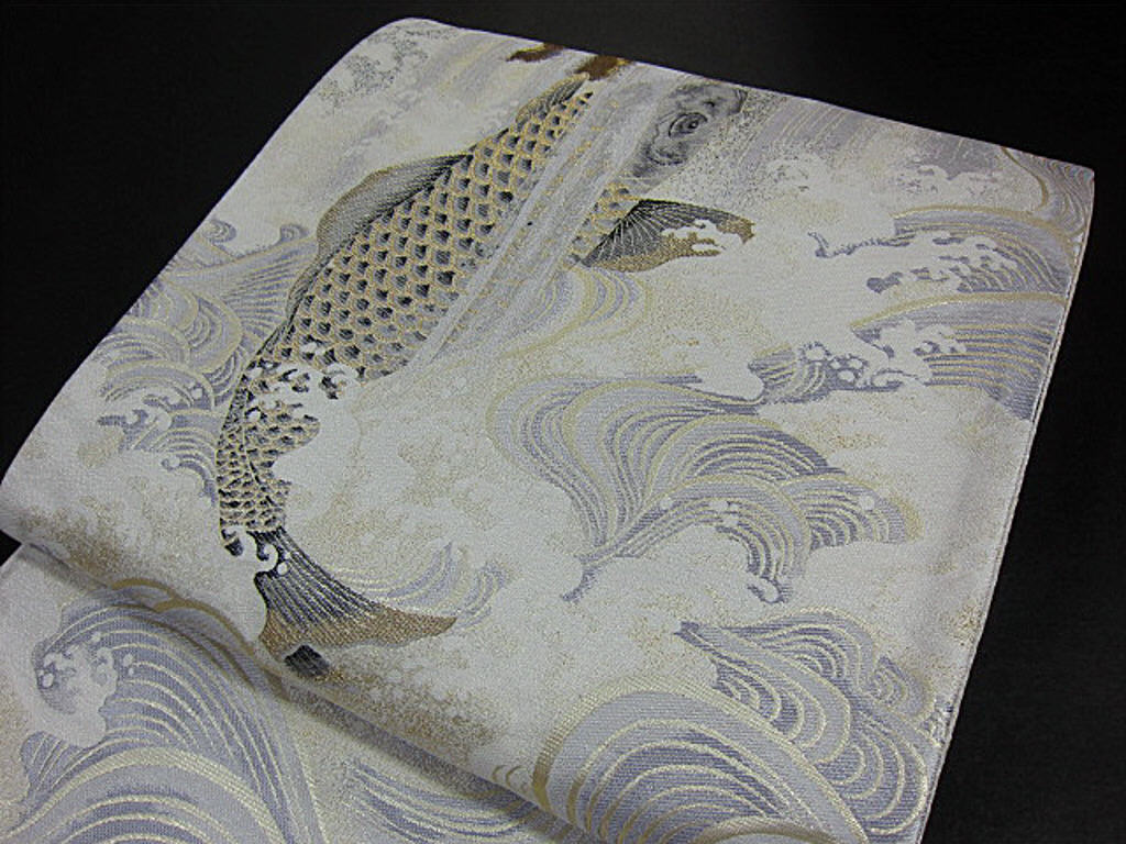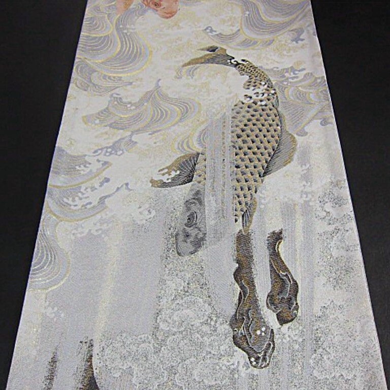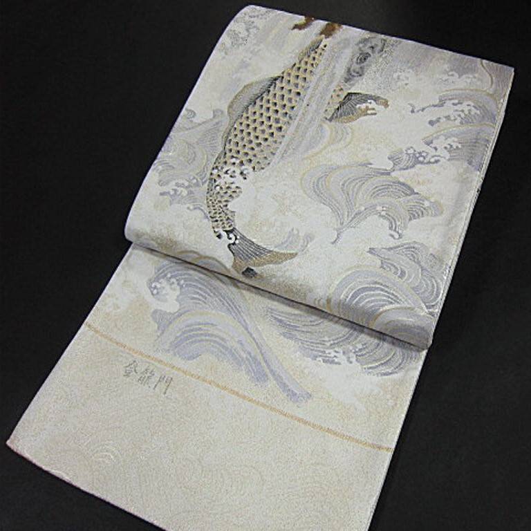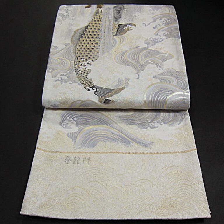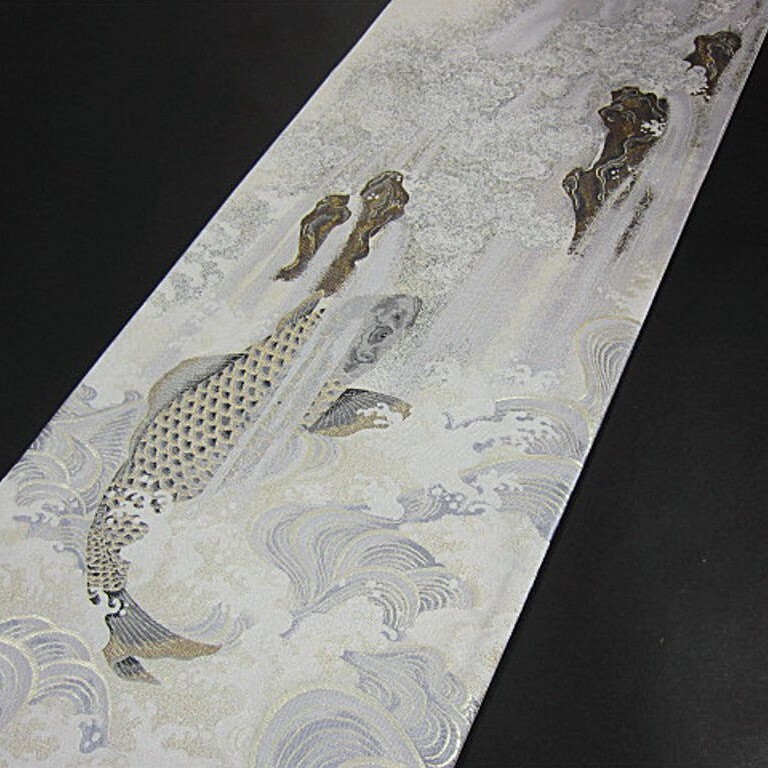 新品未仕立 西陣織袋帯です。 『登龍門』の龍門とは、中国黄河上流にある龍門山を切り拓いててできた急流のことで、その龍門を登りきった鯉はき龍になるという古代伝説に基づき、人の立身出世の関門を登龍門というようになりました。日本でも5月の端午の節句に鯉のぼりを揚げる風習はこの故事に由来し、男児の健やかな成長と立身出世の願いが託されます。』  鯉は滝を登ることから出世の象徴となっており縁起物とされています。縁起の良い柄ですのでフォーマルなお席などにいかがでしょうか色留袖・訪問着・付け下げ・色無地などにいかがでしょうか