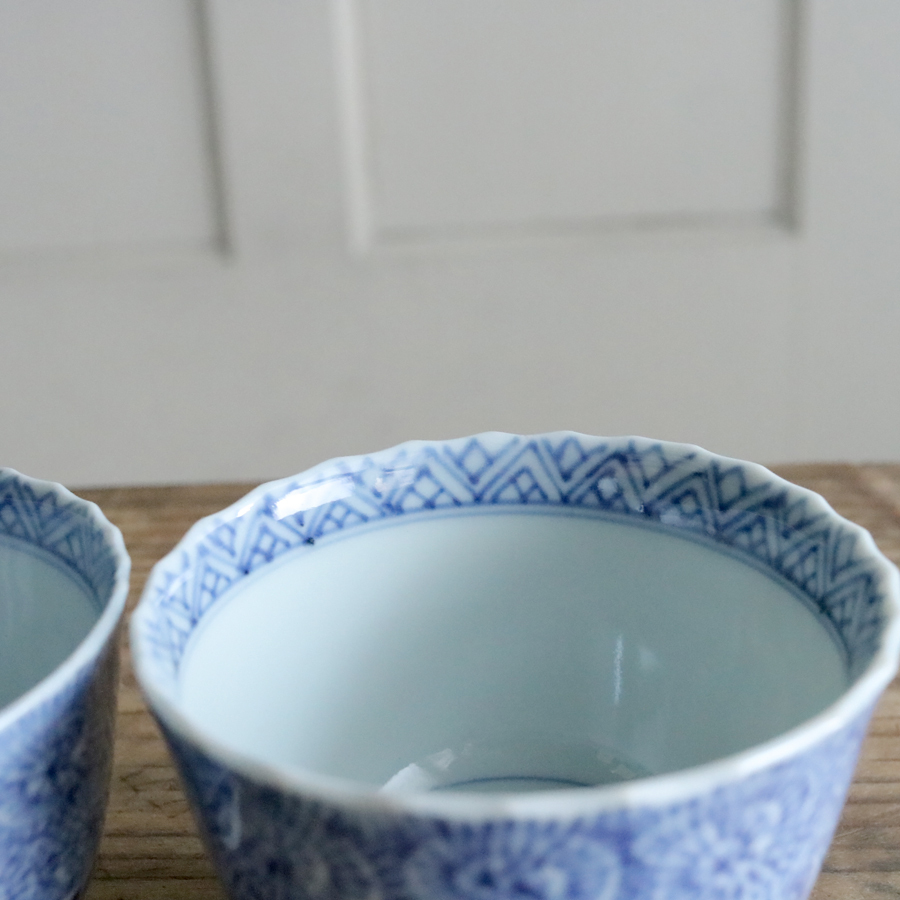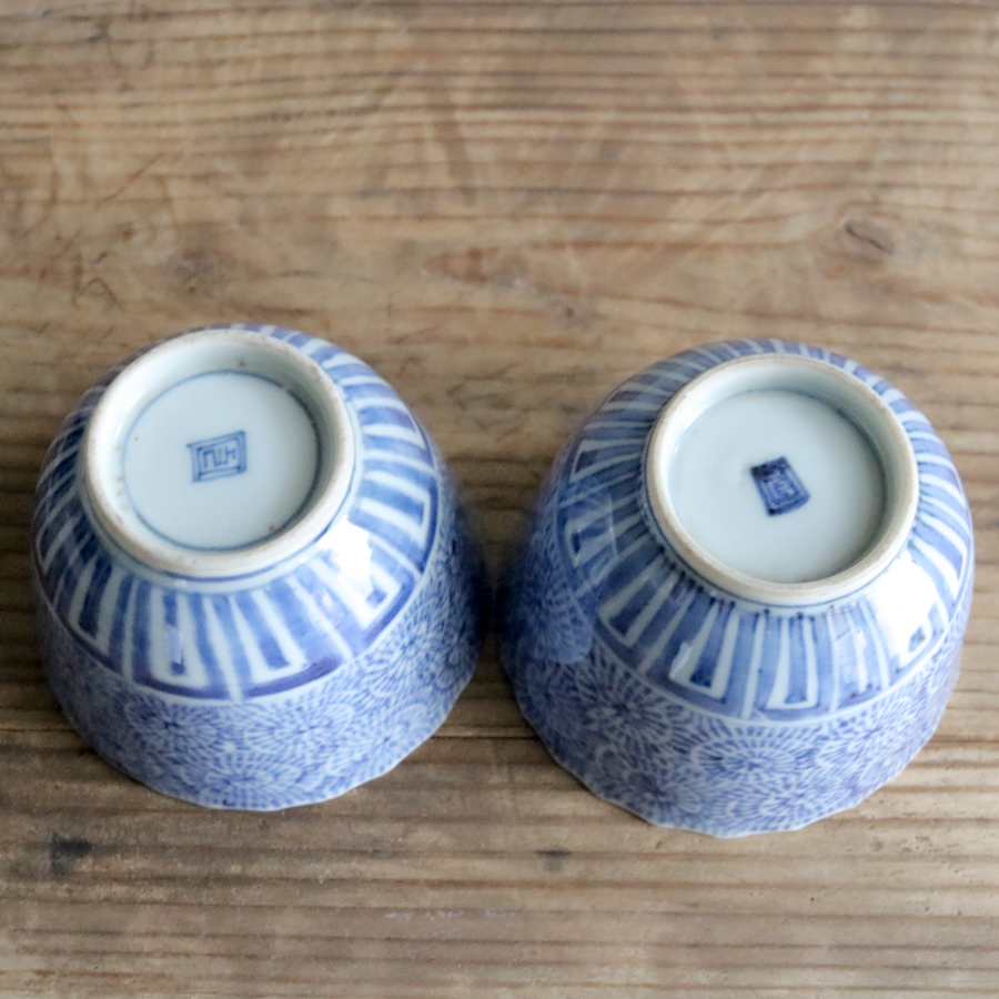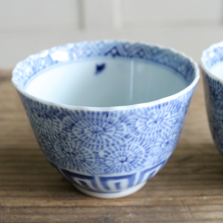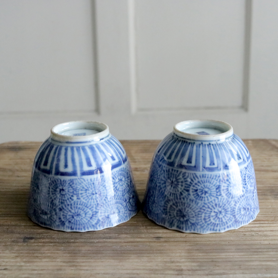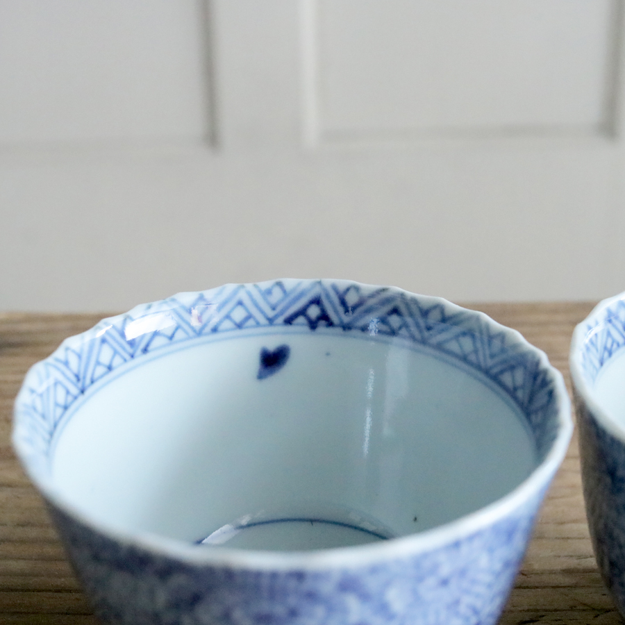 2点セット【江戸時代 後期 古伊万里】染付 そば猪口 花唐草 明治 みじん唐草 猪口 ちょこ 陶器 磁器 骨董 民藝 アンティーク 2