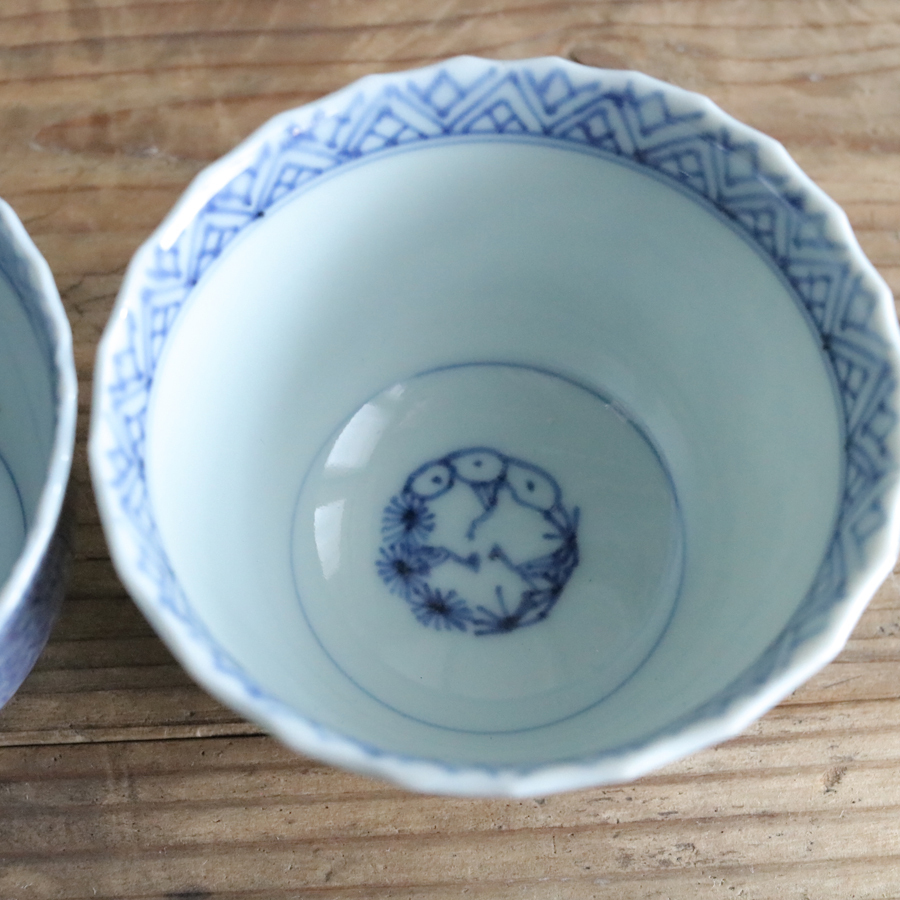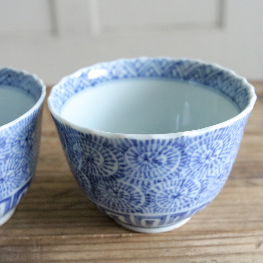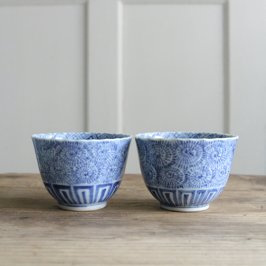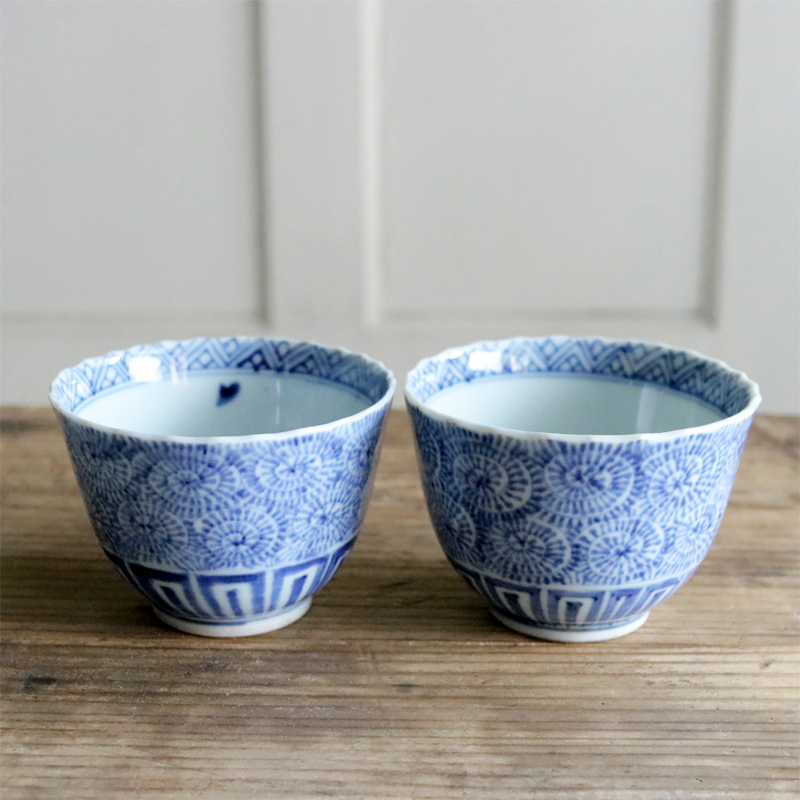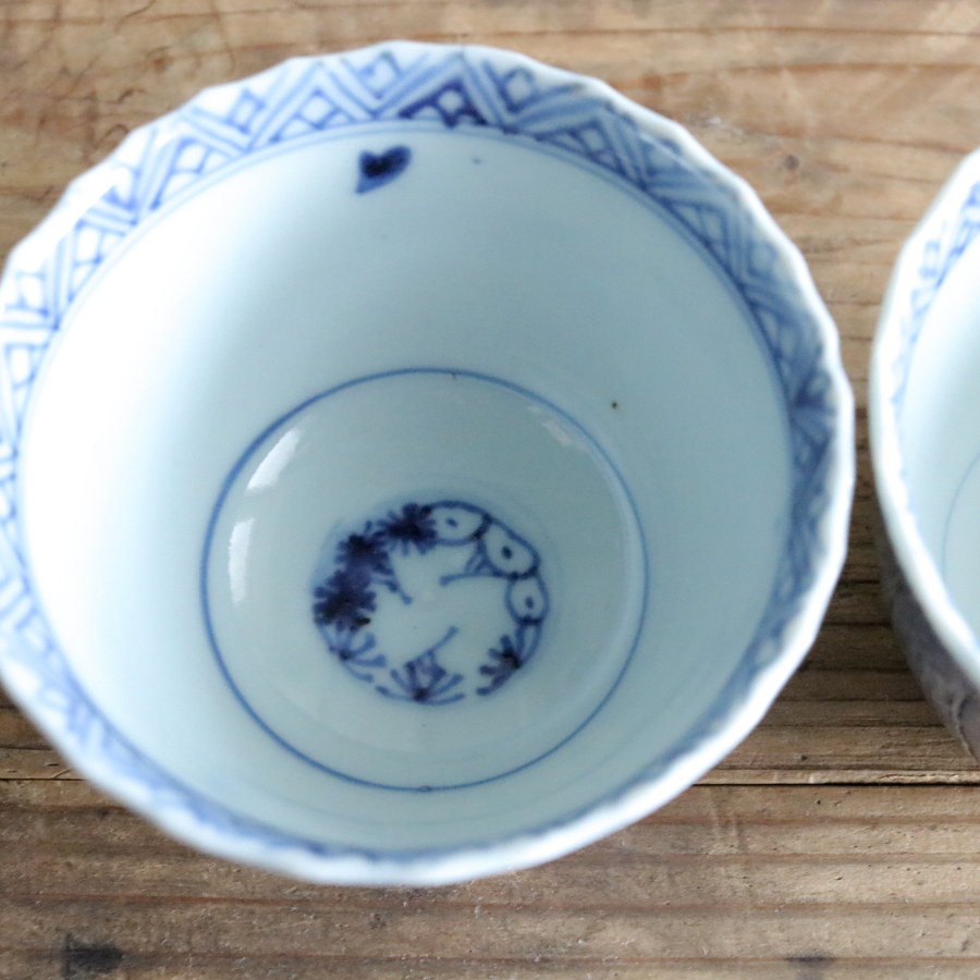 2点セット【江戸時代 後期 古伊万里】染付 そば猪口 花唐草 明治 みじん唐草 猪口 ちょこ 陶器 磁器 骨董 民藝 アンティーク 2