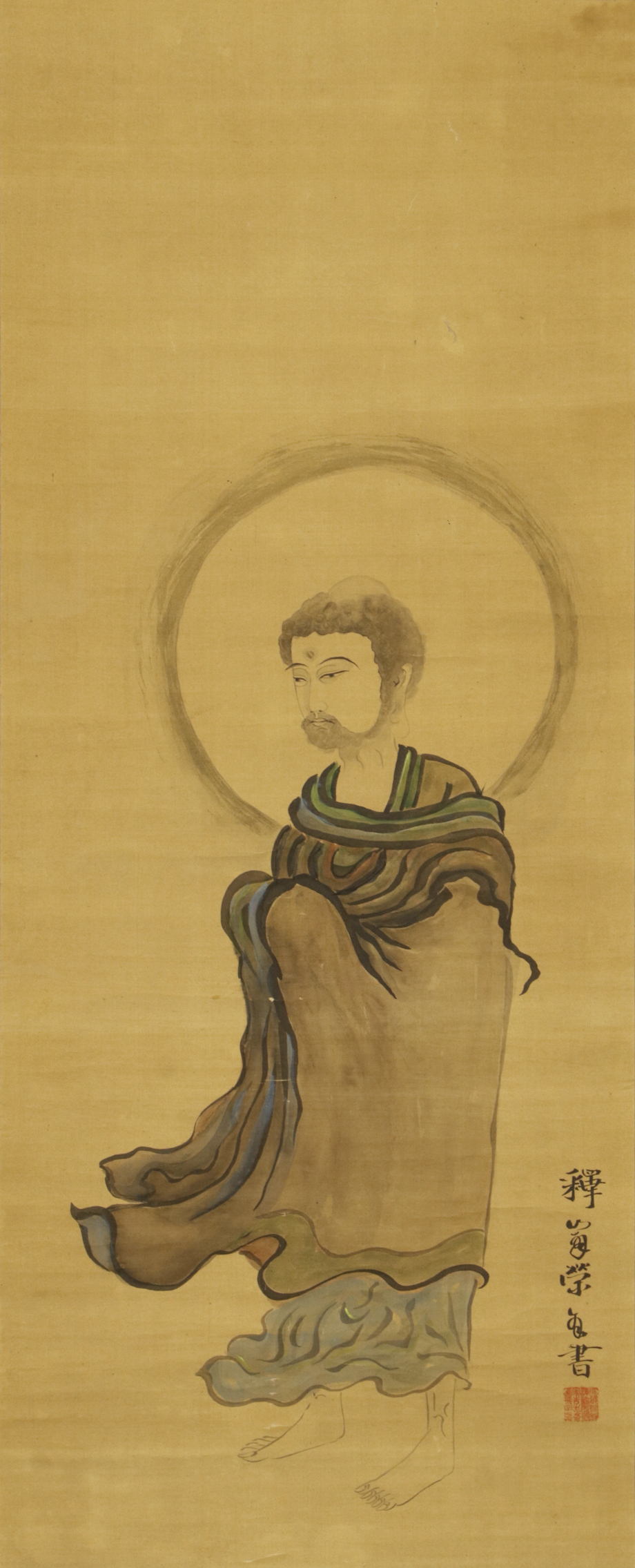 総丈サイズ…横 52 × 縦 185 cm 絹本着色・合箱入 状態…少オレ・少虫穴 表具シミ・少傷ミ 【印刷ではありません】 【真作】 山崎弁栄 浄土宗の僧。下総国手賀沼鷲野谷生。幼名は啓之介、号は仏陀禅那、無所得子、不可知童子。21歳で出家、大谷大康について得度し、筑波山で念仏行を修める。明治27年、インドの仏跡を巡拝。帰国後は光明会を設立し、如来光明主義をとなえた。大正9年(1920)寂、62歳。 |