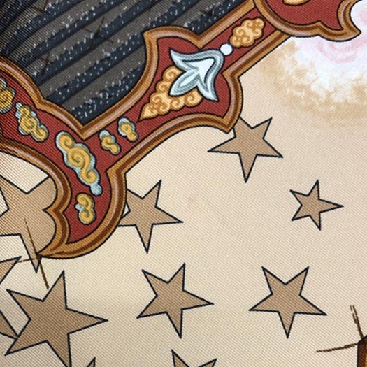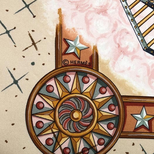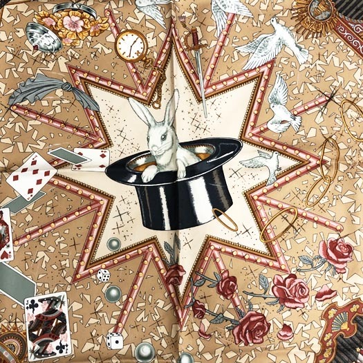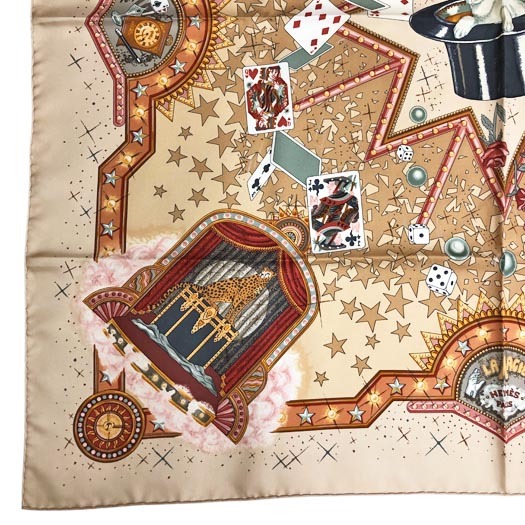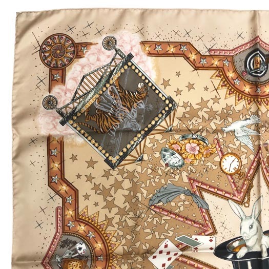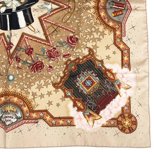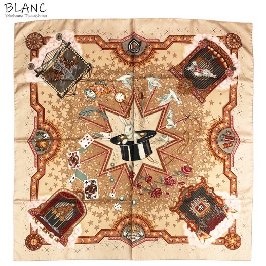 | エルメスのカレ90 スカーフ「LA MAGIE / マジック」です。首に巻いたり、 バッグに付けたり、ヘアアクセサリーにしたり様々なシーンでお使いいただけます。 | ||