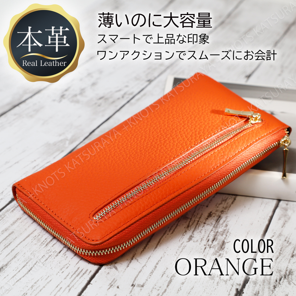 本革 L字ファスナー レディース 長財布★オレンジ★スキミング防止 薄い 薄型 スリム シンプル 軽い 大容量 柔らかい 牛革 レザーa396
