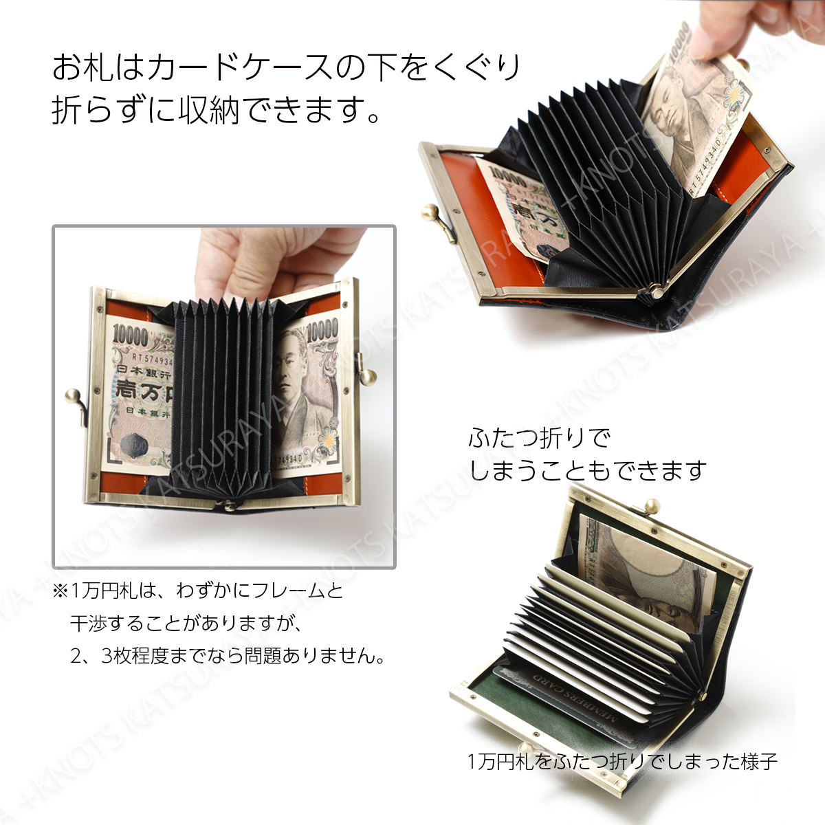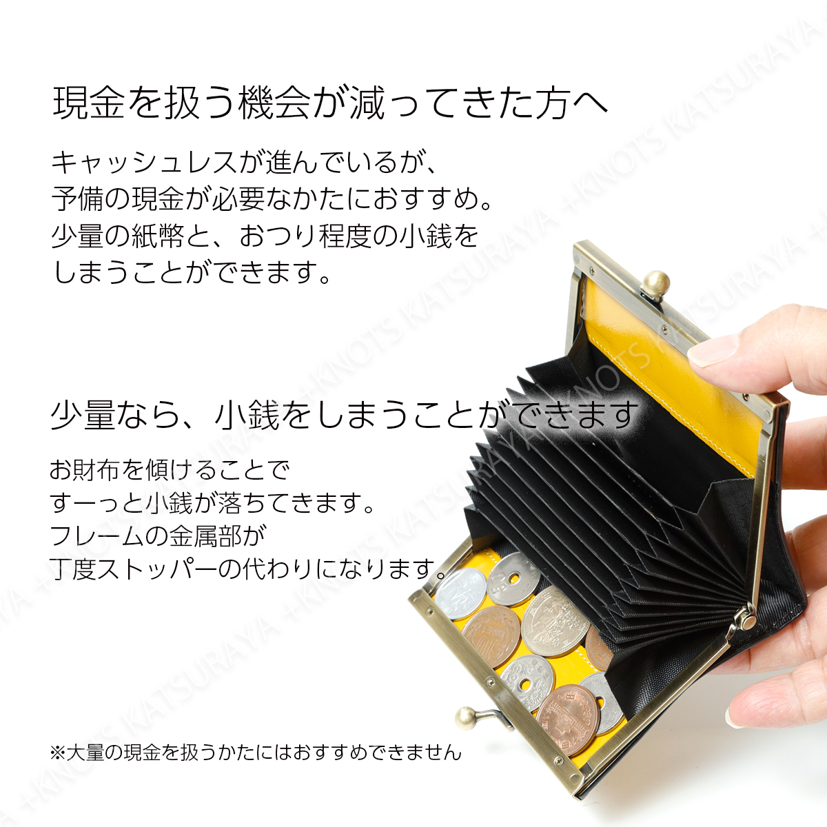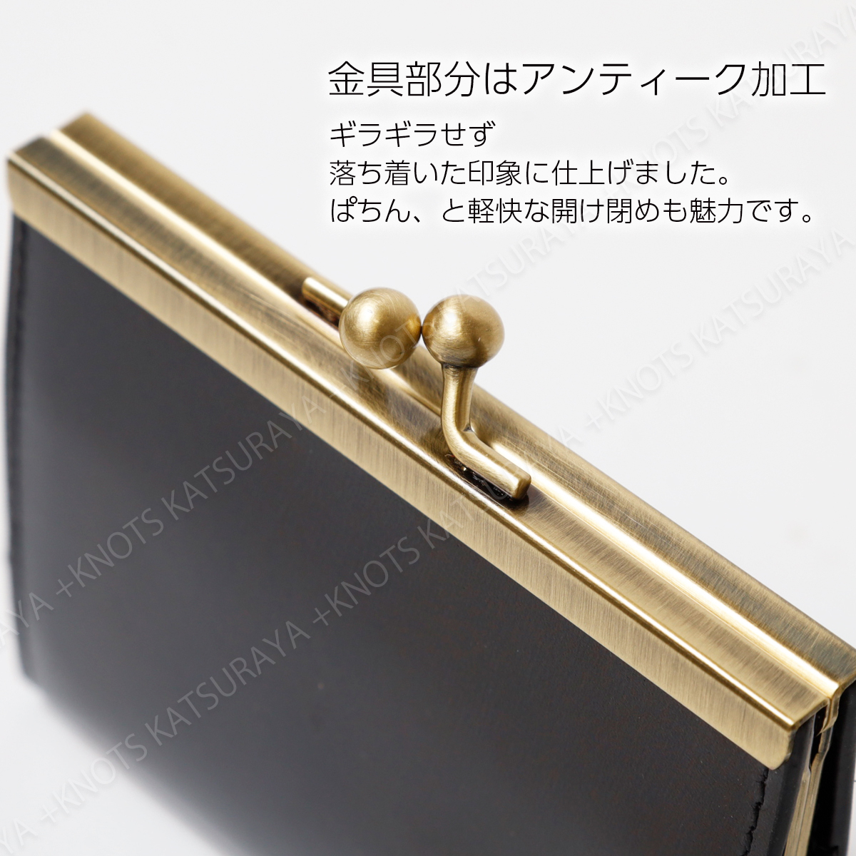 薄くて小さい、ミニバッグバッグと相性の良い本革がま口財布です。蛇腹式カード入れ9か所、カード入れの下を潜ることでお札を折らずに収納できます。少量の小銭も収納可能、現金を扱う機会が減ってきた方におすすめのアイテムです。