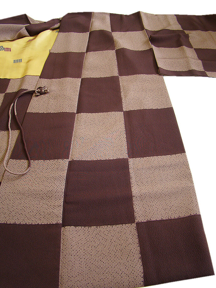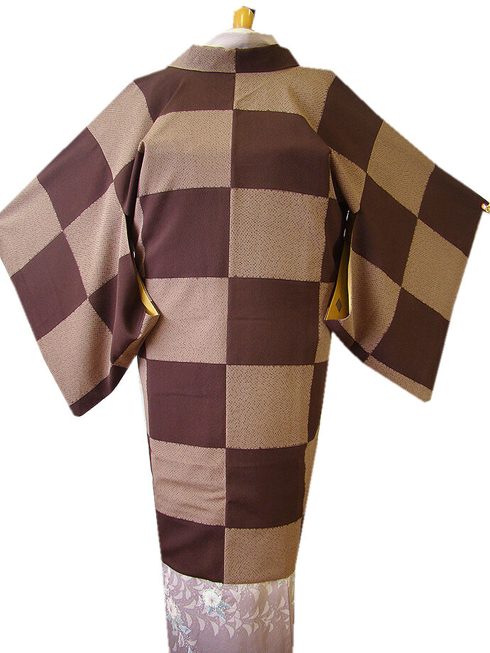 | 商品説明 | とてもしなやかな柔らかな手触りの着心地良い重めの極上ちりめん地の生地。 こげ茶色、胡桃染色の市松に鹿の子柄の染柄。 手縫い仕立。 肩裏も正絹。 |