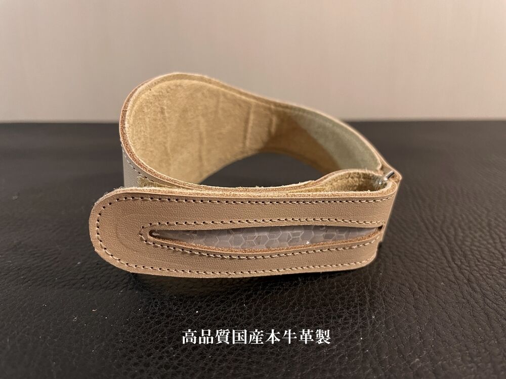 ■製品仕様 ・材質:表/フルベジタブルタンニン鞣し国産本牛革ヌメ革 裏/人工スエード 反射部/フレキシブル高輝度リフレクター ・カラー : NATURAL ・取り付け:ベルクロ ★ハリがあり非常に耐久性に優れた高品質国産本牛革ヌメ革を使用したアンクルストラップです。 日本の革製品専門工房にてハンドメイドされています。 ★内側をより幅広にする設計により裾の広いワイドパンツでも確実に裾を押さえ、チェーンとの接触を防ぎます。 裏面は滑り止め効果の高い人工スエードを全面に配し、ペダリングによるズレを防止します。 ★金具によるバンドを折り返すデザインなので片手で簡単に締め付け、緩めが行えます。 内蔵のリフレクターは柔軟性があるのでストラップの屈曲性を損ないません。 ★内側の幅広部分は内部にしっかりした芯材を用い強度を上げ、厚手のウール、デニム等でもたわまず確実に押さえます。 ★高輝度リフレクターにより夜間の後方、サイドからの視認性を高めます。 ★染色されていない牛革本来の色目のヌメ革ならではの特徴である経年により艶やかなアメ色に変化するエイジングが楽しめます。合皮製のような加水分解による劣化も無く非常に耐久性が高いので末永くご愛用いただけます。 ★チープなナイロン製や合皮製にはない高品質な本革ならではのシックな高級感はクォリティの高いパンツにも違和感なくマッチします。 ★こちらの商品は受注生産になりますので納期5日前後いただきます。 |
