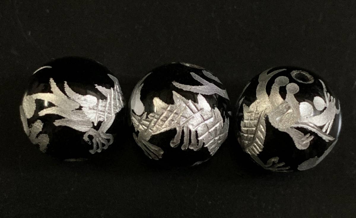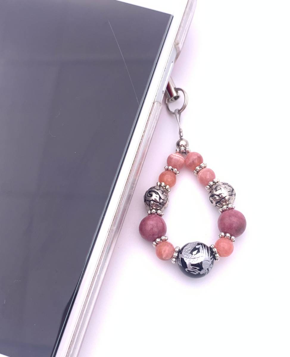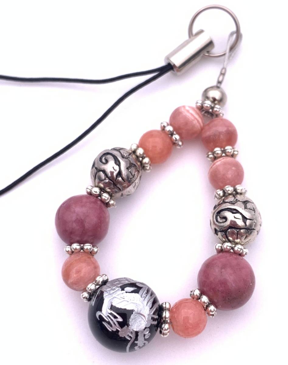 手作り!オリジナル★天然石オニキス銀彫り青龍&ロードナイト&インカローズのストラップ