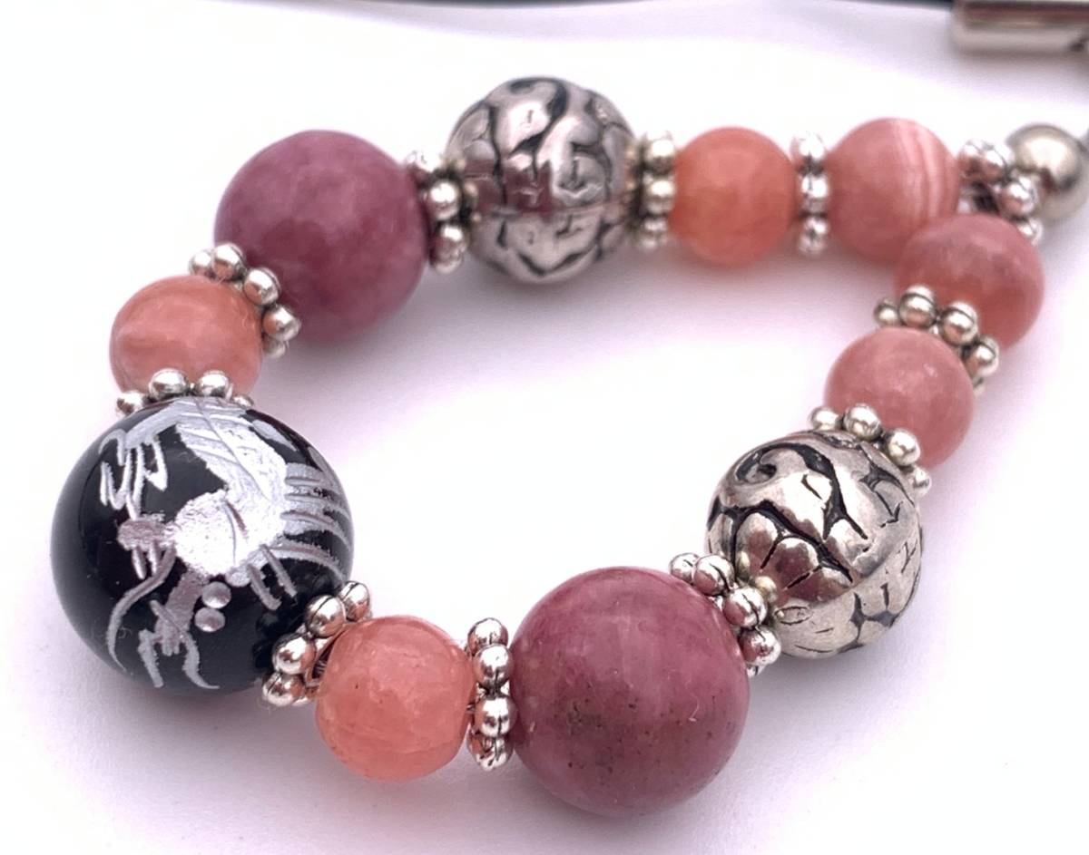 天然石オニキス銀彫り青龍&ロードナイト&インカローズのストラップ