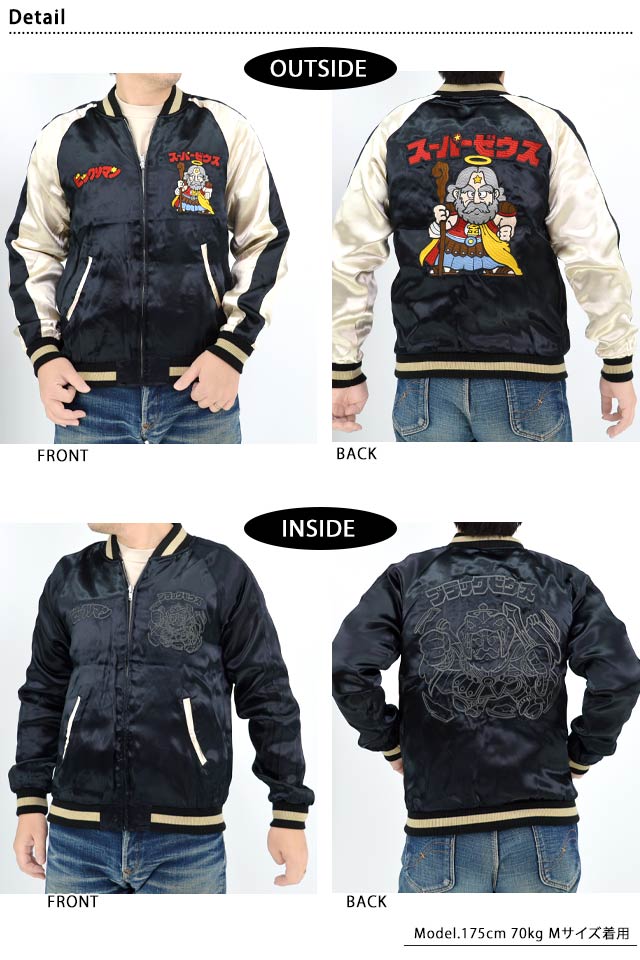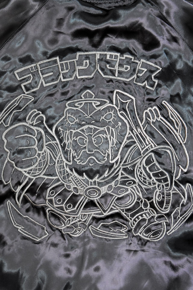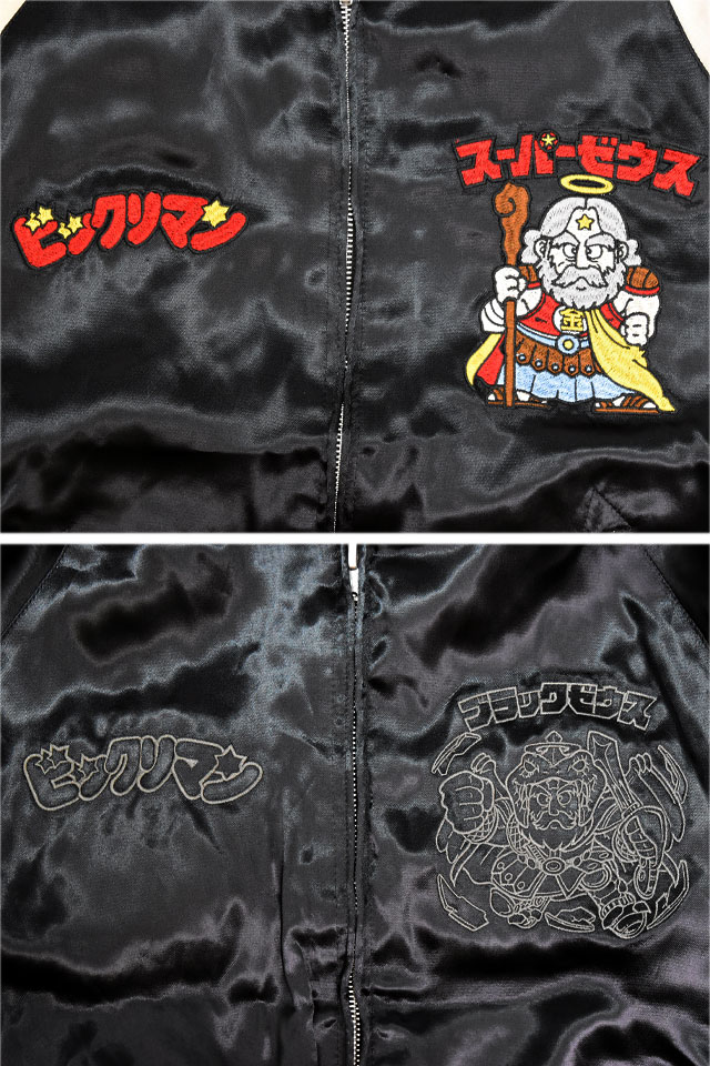 ビックリマン レーヨンリバーシブルスカジャン「スーパーゼウス」(BKM-2501)のご紹介です。 ビックリマンは、1977年に株式会社ロッテより発売されたチョコレート菓子。 おまけとして封入されたシールは大ブームを巻き起こし、今もなお人気を博しています。 今回は、そんなビックリマンをモチーフの主役に採用したスカジャンが登場しました! こちらのスカジャンはリバーシブル仕様になっています。 表面にはスーパーゼウスをフルカラーで刺繍しました。 さらに裏面には、ブラックゼウスをこちらはアウトラインのみでデザイン。 合わせるアイテムによって表裏使い分けていただけるデザインに仕上がっています。 ボディーにはレーヨンサテンを使用し、ドレープや陰影がくっきりと現れています。 | ||||||||||||||||||||