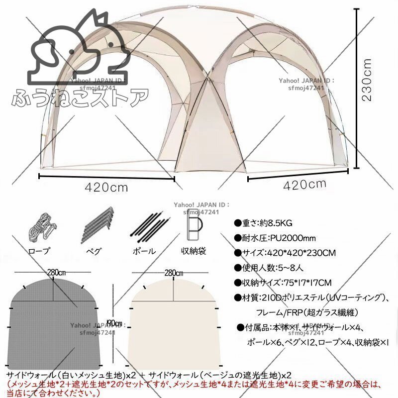 使用サイズ:タープ:約420 x 420 x 230(h)cm/サイドウォール:約280 x 190cm