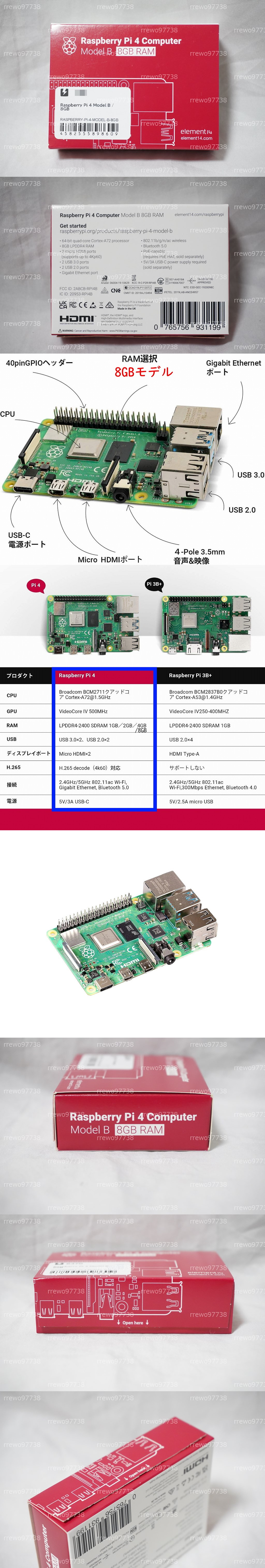 | 商品説明 | ラズベリー財団から発売されているキット「ラズベリーパイ Raspberry Pi 4 Model B 8GB RAM技適対応 新品、未開封品」です。 現在半導体不足による影響で販売価格の値上げ(定価が上がりました)および生産量の関係上8GB RAMモデルは大幅に品薄となっておりますので、この機会をお見逃しなく。 製品名: Raspberry Pi 4 MODEL B CPU: Broadcom BCM2711 4コア 1.5GHz(Cortex A72) RAM: LPDDR4-2400 8GB版 ※オープンハードウェア系では非常に大容量のRAMを搭載 Wi-Fi(無線LAN): 802.11 a/b/g/n/ac 2.4/5GHz帯両対応 有線LAN: 1000Mbps RJ45ポート(BCM54213PE) Bluetooth: Ver5.0 USB: USB 3.0 Type-A×2ポート(VLI VL805/PCIe)、USB 2.0 Type-A×2ポート ストレージ: micro SDXC対応カードスロット(SD4.0) ディスプレイ出力: micro-HDMI 2.0×2(4K 60Hz対応)、GPIOピンヘッダ 電源入力: USB Type-C 5V/3A Windows 10 IoTやRasbian、Linux系など多種多様なOSを利用できるコンパクトなPCとなっており、無線LAN、有線LAN、HDMI出力、USB 3.0 Type-A、USB Type-Cポートを搭載しているため様々な用途にお使いいただけます。 スペックやレビューは Raspberry Pi 4 Model B Review Raspberry Pi 4 Review: The Gold Standard for Single-Board Computing Raspberry Pi 4 Model B Review より。 落札時の参考にして下さい。 【商品状態】 10個購入しておりましたが、検証作業を終えてしまったため予備の分(新品、未開封)を処分させて頂きます。 現在半導体不足による影響で販売価格の値上げ(定価が上がりました)および品薄となっておりますので、この機会をお見逃しなく。 <<注意事項をよく読まず、落札後に権利を放棄されるような方には落札して頂きたくありません。以下注意事項をよく読み、同意できる日本人のみ入札をお願い致します。>> 【オプション】 ◇周辺機器 ・5V/3A 電源アダプタ(電源ON/OFFボタン付コンセント→Type-Cケーブル) +3,500円 ・ケース+5V/3A電源アダプタ+冷却ファン+ヒートシンクセット: +7,000円 ・Windows 11 Home/Pro両対応リカバリー用USBメモリ 追加 +5,500円 ・USB Type-C→USB PD対応Type-C充電ポート、USB3.0×2ポート、有線LAN、HDMI出力拡張ドック 追加: +4,240円 ・USB 3.0対応3TB外付けHDD 追加: +8,640円 ・Quick Charge 3.0対応10,000mAh 日本製モバイルバッテリー 追加: 3,000円 ・無線マウス 追加:+2,500円 ・無線マウス + 無線キーボードセット 追加:+5,500円 ・Micro SDHC 約32GB 追加:+1,800円 ・Micro SDXC 約64GB 追加:+3,600円 ・Micro SDXC 約128GB 追加:+5,800円 ・Micro SDXC 約256GB 追加:+16,500円 ・Micro SDXC 約512GB 追加:+65,000円 ・Micro SDXC 約1TB 追加:+95,600円 ◇充電器 ※ACアダプタが必要な方はご連絡ください ・USB Power Delivery対応 約65W充電器(コンセント→USB Type-C) 追加: +6,480円 ・USB Type-C to Type-C PD対応1mケーブル 追加: +1,560円 表裏のないリバーシブル端子USB Type-C規格で充電、データ通信を行うため、充電ACや充電ケーブルをお持ちでない場合はこの機会に是非どうぞ。 ◇外付けモニター ・約21.5インチ フルHD解像度(1920×1080) モニター: +15,000円 ・約24インチ フルHD解像度(1920×1080) モニター: +19,000円 ・約27インチ WQHD解像度(2560×1440) モニター: +35,000円 ・約27インチ 4K2K解像度 モニター: +40,000円 ・約31.5インチ 4K2K解像度 モニター: +45,000円 ※デュアルモニターでデスクトップを2つ表示する事で文字の見易さや作業効率が大幅に向上します 必要でしたら取引連絡時にお申し付けください。 商品の状態は以下画像より。 ![]() |