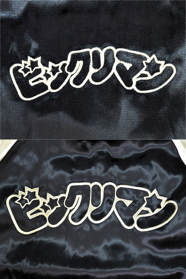 ビックリマン レーヨンリバーシブルスカジャン「ヘラクライスト」(BKM-2503)のご紹介です。 ビックリマンは、1977年に株式会社ロッテより発売されたチョコレート菓子。 おまけとして封入されたシールは大ブームを巻き起こし、今もなお人気を博しています。 今回は、そんなビックリマンをモチーフの主役に採用したスカジャンが登場しました! こちらのスカジャンはリバーシブル仕様になっています。 表面にはヘラクライストをフルカラーで刺繍しました。 さらに裏面には、ビックリマンのロゴをアウトラインのみでデザイン。 合わせるアイテムによって表裏使い分けていただけるデザインに仕上がっています。 ボディーにはレーヨンサテンを使用し、ドレープや陰影がくっきりと現れています。 | ||||||||||||||||||||