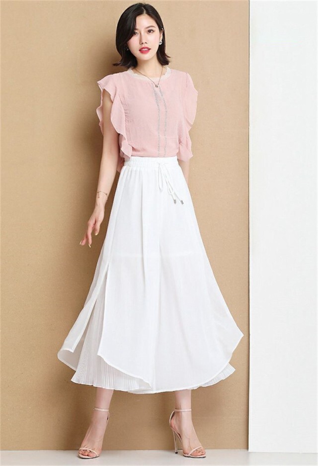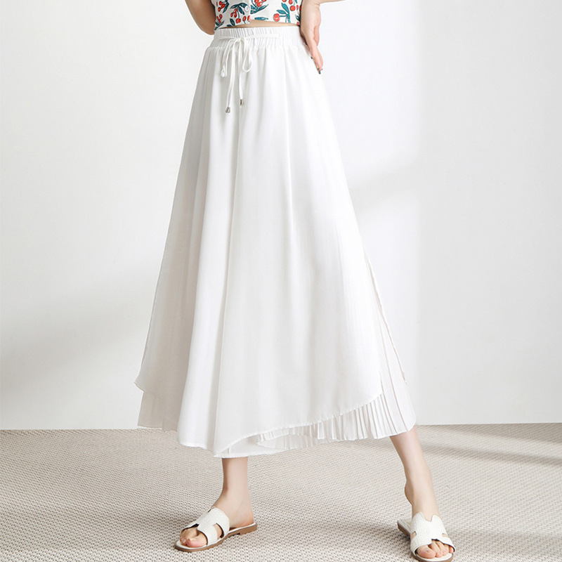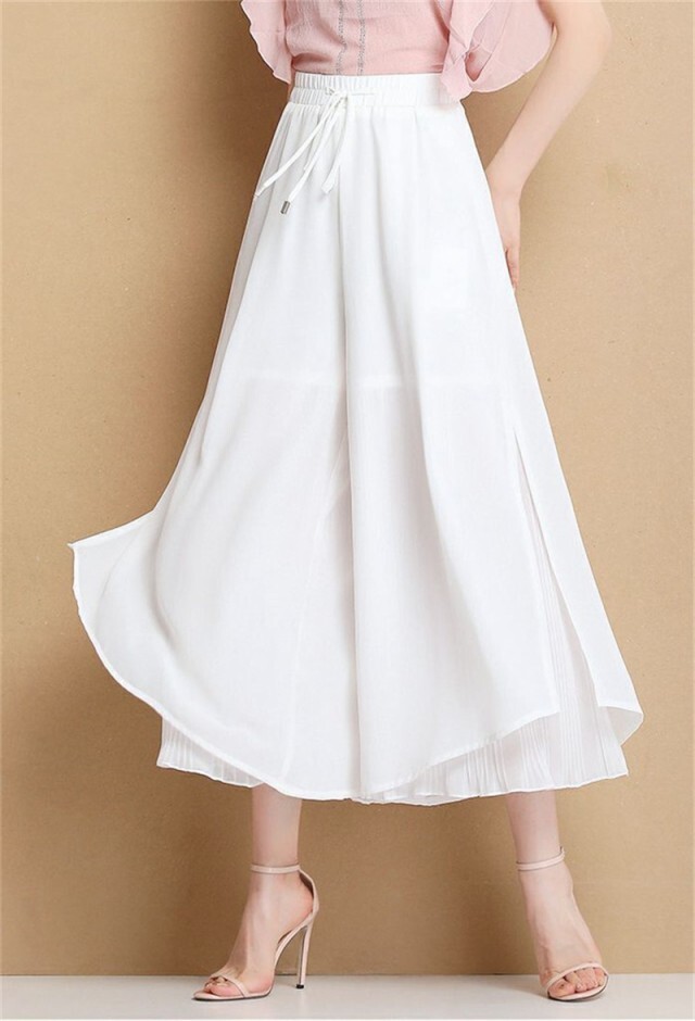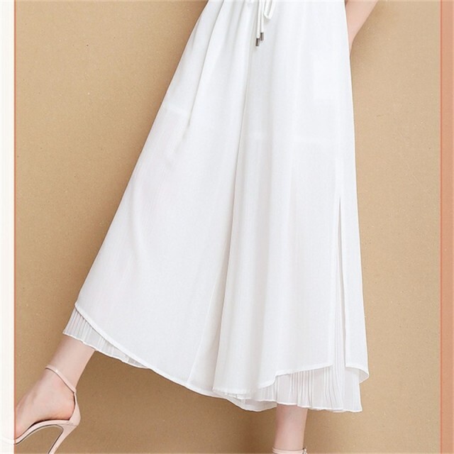 ガウチョパンツ 裾プリーツ 切り替え ワイドパンツ レディース シフォン フレアパンツ スカーチョ ゆったり ホワイト XL