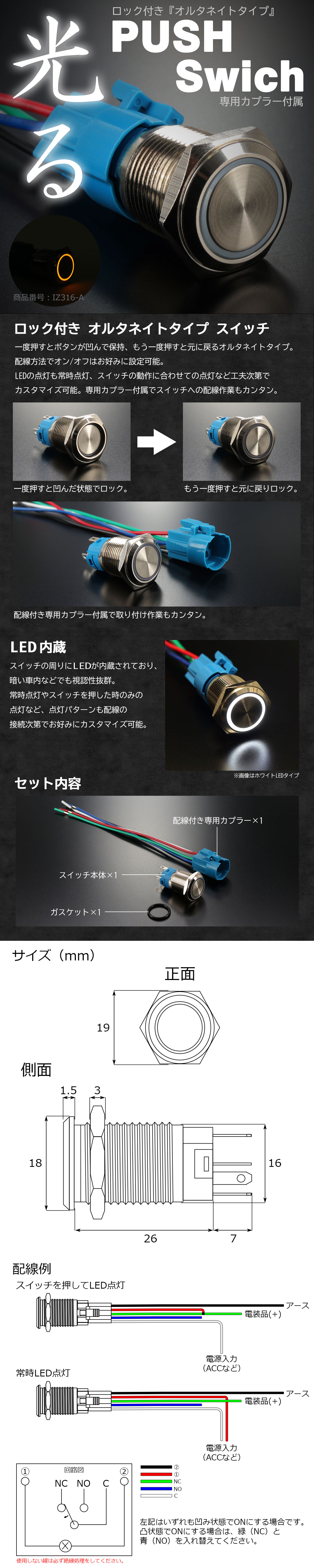 ■商品コード IZ316-A ■商品タイトル プッシュスイッチ 18Φ アンバー LEDリング付き オルタネイトタイプ ■商品説明 一度押すとボタンが凹んで保持、もう一度押すと元に戻るオルタネイトタイプ。 配線方法でオン/オフはお好みに設定可能。 LEDの点灯も常時点灯、スイッチの動作に合わせての点灯など工夫次第で カスタマイズ可能。専用カプラー付属でスイッチへの配線作業もカンタン。 ■商品概要 ・LEDカラー:アンバー ・スイッチ種類:オルタネイト式 ・動作電圧:DC12V (MAX 3A) ・入数:数量1で1セット ■サイズ:画像に掲載 ■注意 ※出品商品はタイトルのサイズ・発光色です。 ■その他カラー |