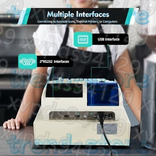 【多機能外部インターフェイス】:USBポートに加えて、レジには他の2つのポートも装備されており、バーコードスキャナーとレシートプリンター(RS232)を追加して、フロントデスクとキッチンでの同時印刷を容易にすることができます。