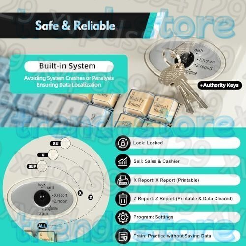 【多機能】このレジは最大10,000PLUを保持でき、幅広い在庫管理機能を提供します。さらに、日次の売上フロー、返品、割引のログを記録し、レジレポート、部門レポート、PLUレポート、時報、統合日報、月次レポートなどのさまざまな種類のレポートを生成し、管理することができます。データをタイムリーに追跡します。