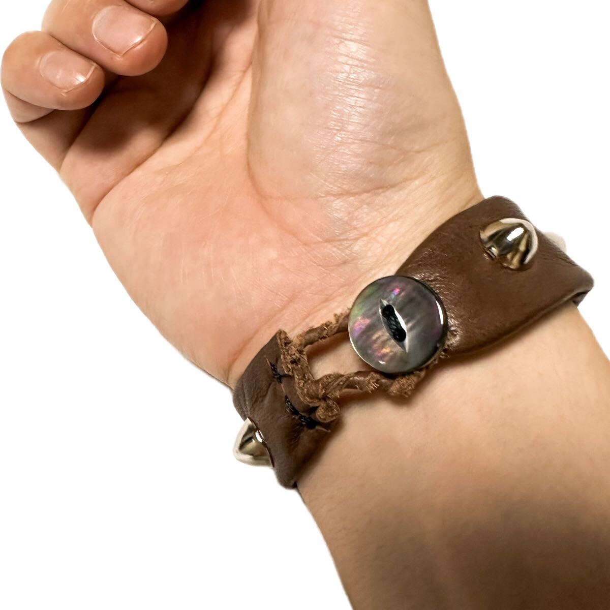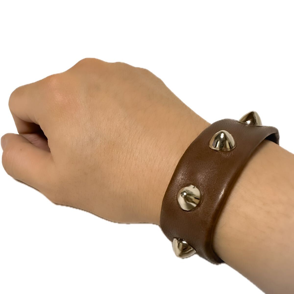 上質な本革とゴツゴツしたスタッズの相性がよく、柔らかな革が腕にフィットします。