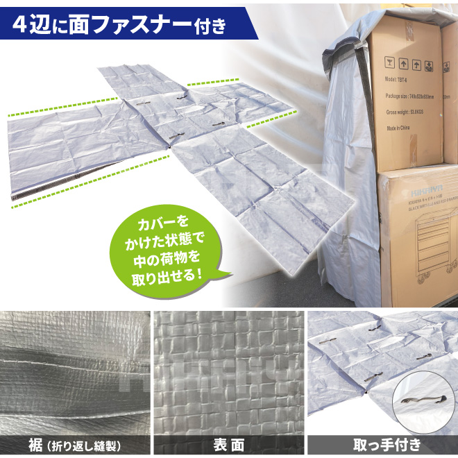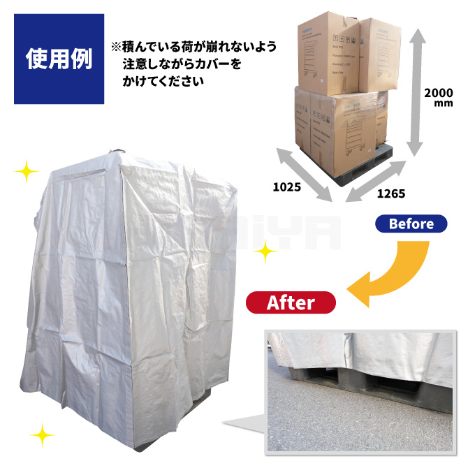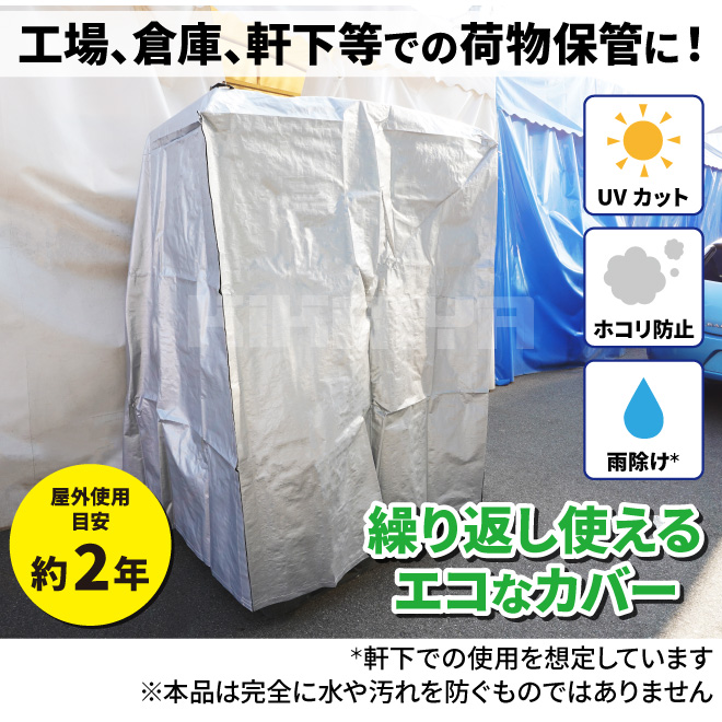 ●工場、倉庫、軒下等での荷物保管に最適なカバーです ●日焼け防止(UVカット)、ホコリ防止、雨除けに ※軒下での使用を想定しています ※本品は完全に水や汚れを防ぐものではありません ●環境にやさしい繰り返し使える資材です ●4辺にマジックテープがついており、カバーを展開することも可能です カバーをかけた状態で中の荷物を取り出すことも可能、一人でのカバー脱着も簡単です ●11型(1100×1100mm)や14型(1400×1100mm)のパレットより幅が広く、オーバーハングしている荷物にも対応可能です ●屋外使用目安 約2年 ※屋外でご使用の場合、台風などの強風時にカバーが飛ばされないようご注意ください |