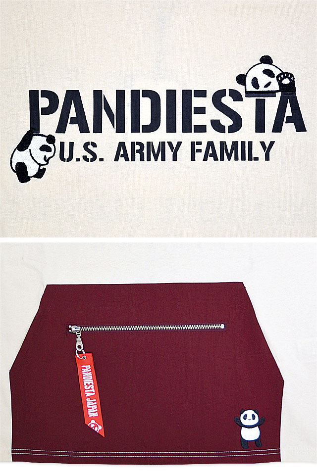 和柄ブランド【錦】の姉妹ブランドとして誕生した、お茶目なパンダをモチーフとした【PANDIESTA JAPAN】より「PDJ-ARMYミリタリーポケット半袖Tシャツ(554950)」のご紹介です。 今や、錦の定番モチーフとなった「錦PANDA」!! 今回は、通気性と吸汗性に優れた綿100%の天竺素材をベースに使った半袖Tシャツが登場しました。 ポリエステルナイロン素材の布帛生地を用いてプルパーカーのようなカンガルーポケットをフロントにデザインしました。 配色切替や凹凸感のある発砲プリントで施したパンダアイコンのバックモチーフにより、武骨なイメージになりがちなミリタリーアイテムを可愛らしくデザインした一枚です。 | |||||||||||||||||||||||||