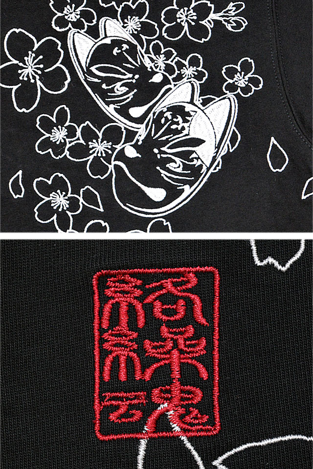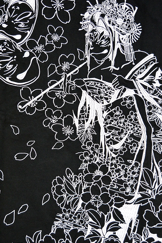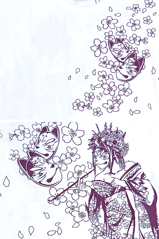 絡繰魂さんから「花魁彫り半袖Tシャツ(242125)」のご紹介です。 アウトラインのみで表現されたデザインが魅力的な総刺繍の半袖Tシャツです。 背中には狐面を身に着けた花魁の姿をデザイン。 裾にはブランドロゴが印風に表現されています。 フロントには背景にも用いられていた狐面を配置しました。 それぞれのボディーカラーに合わせて用いる色味にも変化を持たせ、異なる表情に仕上げました。 ボディーには、刺繍に負けないコシのある綿100%の生地を使用。 | |||||||||||||||||||||||||