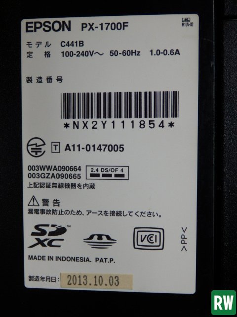 | ビジネスプリンター 複合機 カラー インクジェット エプソン EPSON PX-1700F ページプリンタ 100V 2013年製 幅550×奥行460×高さ365mm |