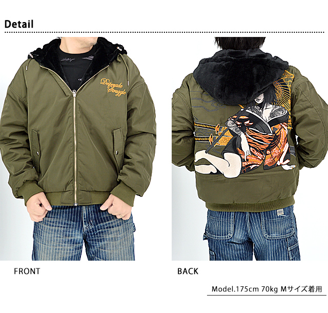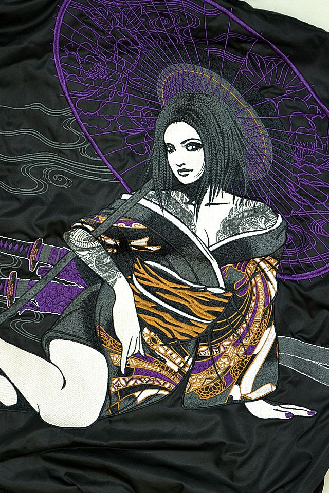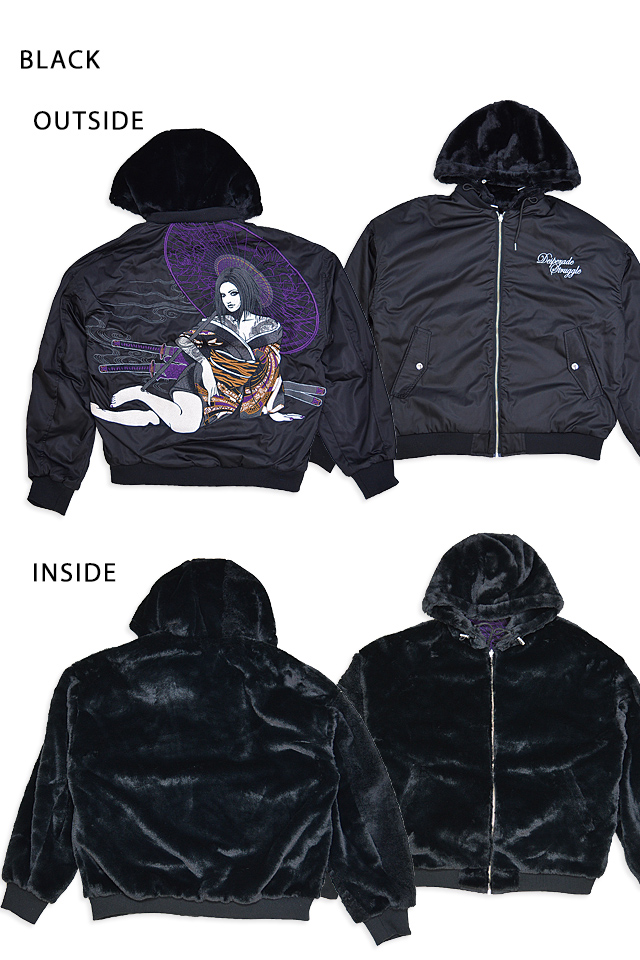 絡繰魂の姉妹ブランドとして誕生した、従来の和柄から抜け出し、和の持つ美しさを融合させた【抜刀娘】から「抜刀娘 凛リバーシブルMA-1ブルゾン(234013)」のご紹介です。 表裏どちらも使えるリバーシブルタイプのアウターが登場しました! 今回は贅沢な総刺繍デザインとなっております。 着物や帯の柄まで細かく描き込みが施されているところも抜刀娘ならでは。 フロントはジップアップ仕様。 | |||||||||||||||||||||||||