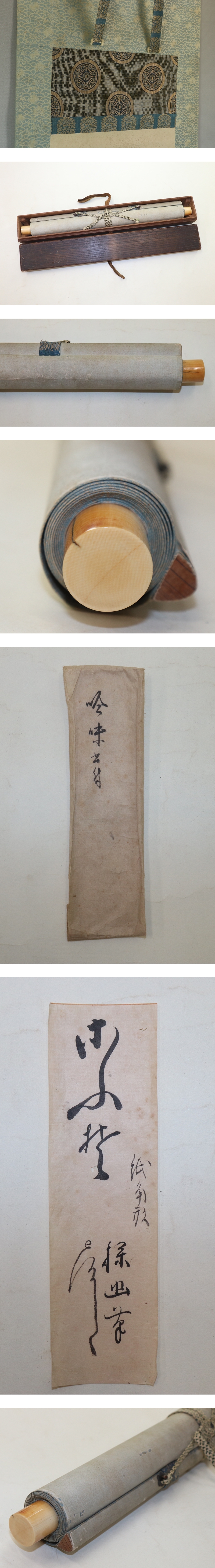 狩野探幽 かのう-たんゆう(1602-1674) 江戸前期の画家。鍛冶橋狩野派の祖。孝信の長男、尚信・安信の兄。 幼名は釆女、通称は守信、別号に白蓮子・生明等。 狩野派に新風をもたらし、同派中興の祖と仰がれた。 のち法眼に叙せられ、探幽斎と名のる。延宝2年(1674)歿、73才。 本紙は、染み、汚れ、折れ、皺、ヤケがあります。 表装は、染み、汚れ、折れ、皺、虫食い、破れ、ほつれ、軸先に汚れとヒビがあります。 【サイズ】 作品 横約27cm×縦約32.5cm 表装 横約39cm×縦約114cm |