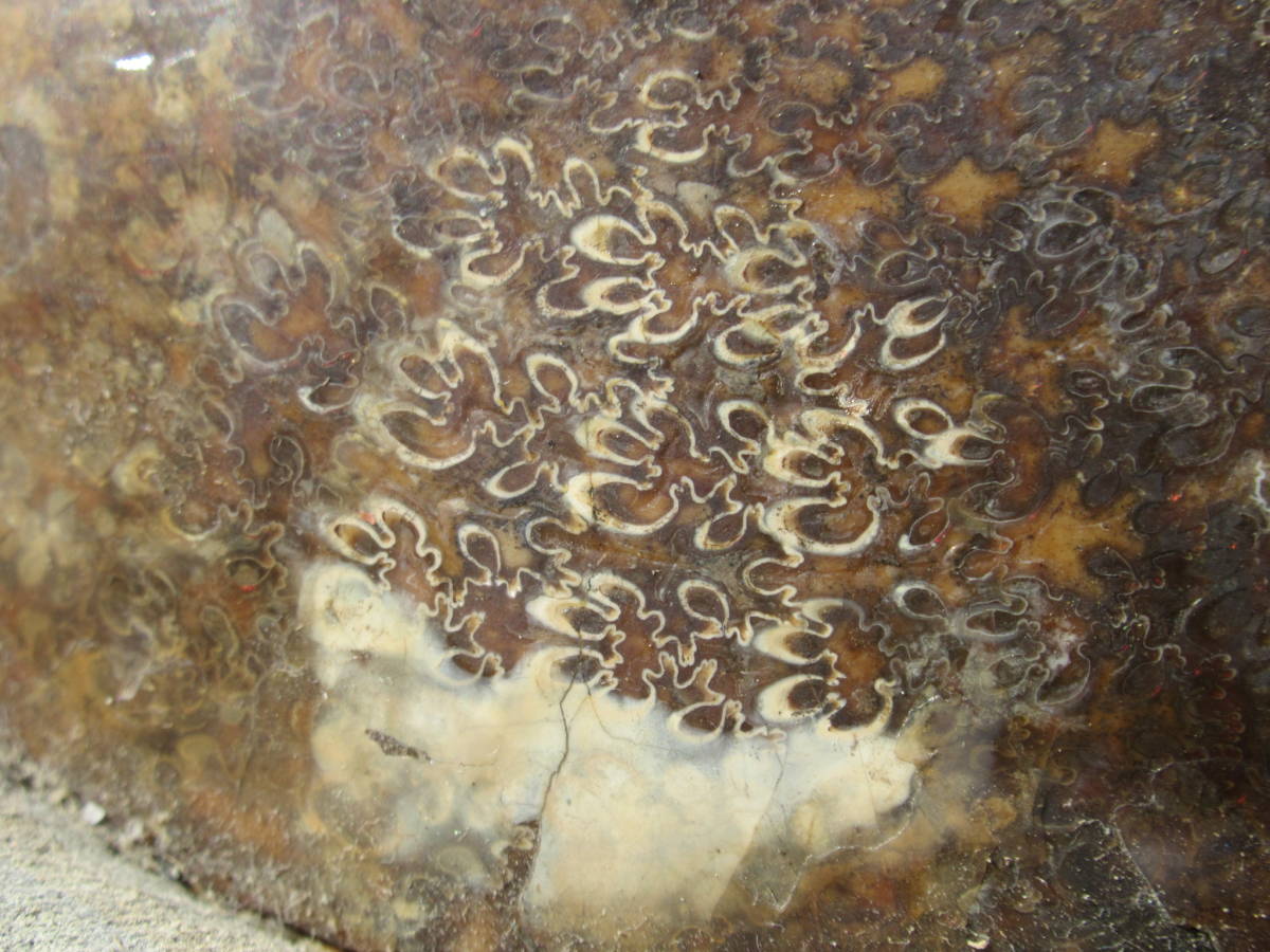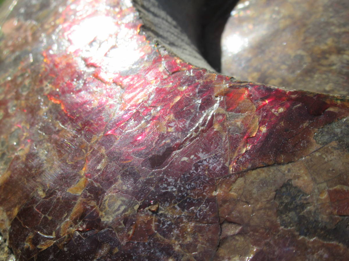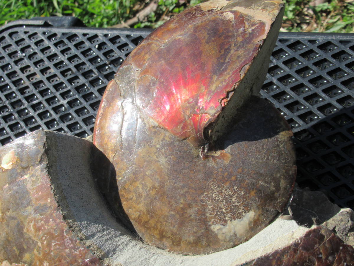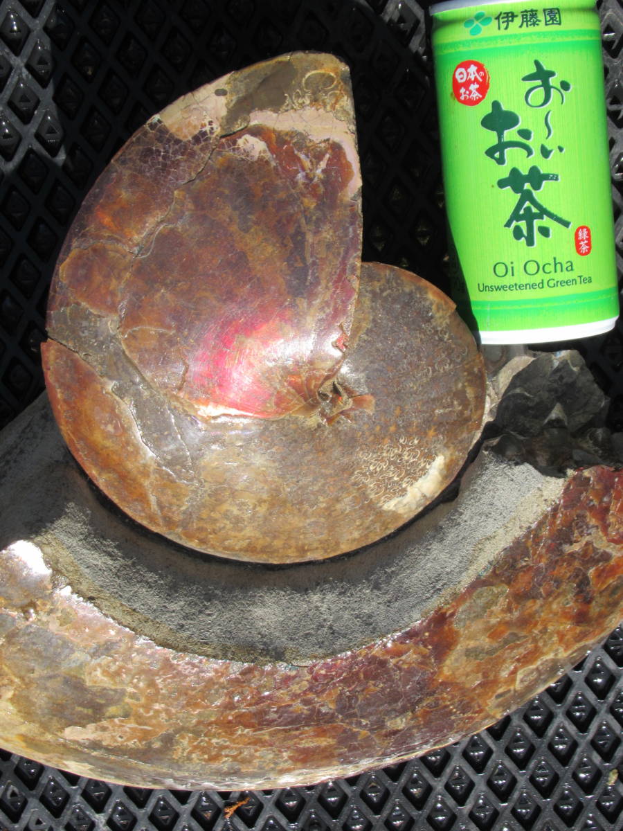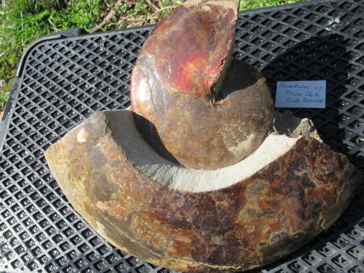 Placennticeras sp.白亜紀Pierre Shale、South Dakota。大きめのプラセンティセラスの中心近くがディスク状に残り、その外側の巻き部分の重なりをチゼルで取り除き赤を主とするイリデッセンスな殻を目立たせた形で裏側は化石表層がかなり失われています(画像10)。殻のすべての面がイリデッセンス面ではなく色が鈍い部分もあります。また中央ディスクにはイリデッセンス部分の他に縫合線部分(画像9)もあります。全体サイズ幅と高さ290/260mm、中央ディスク部分タテヨコ170/135mm。厚さ最大で80mm。送料無料。