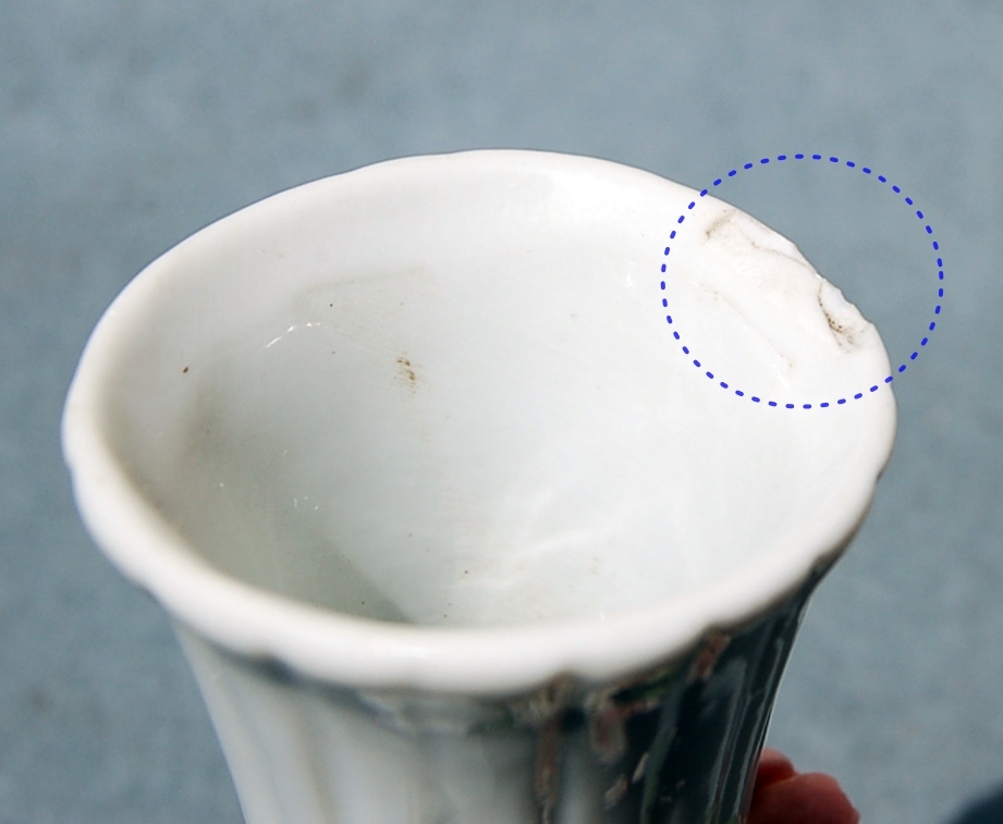 上部の縁に欠けがあります。花弁及び葉にもチラホラ欠けが見て取れます。