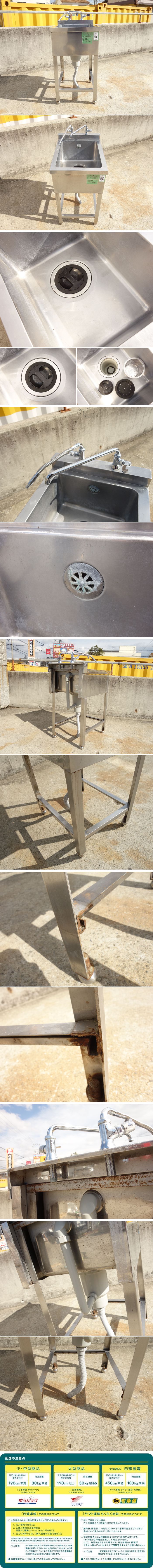 【中古】M▽業務用 厨房用 流し台 シンク ステンレス 一槽 水栓 バックガード 幅450×奥行600×高さ800~850~960 (Fe1472)