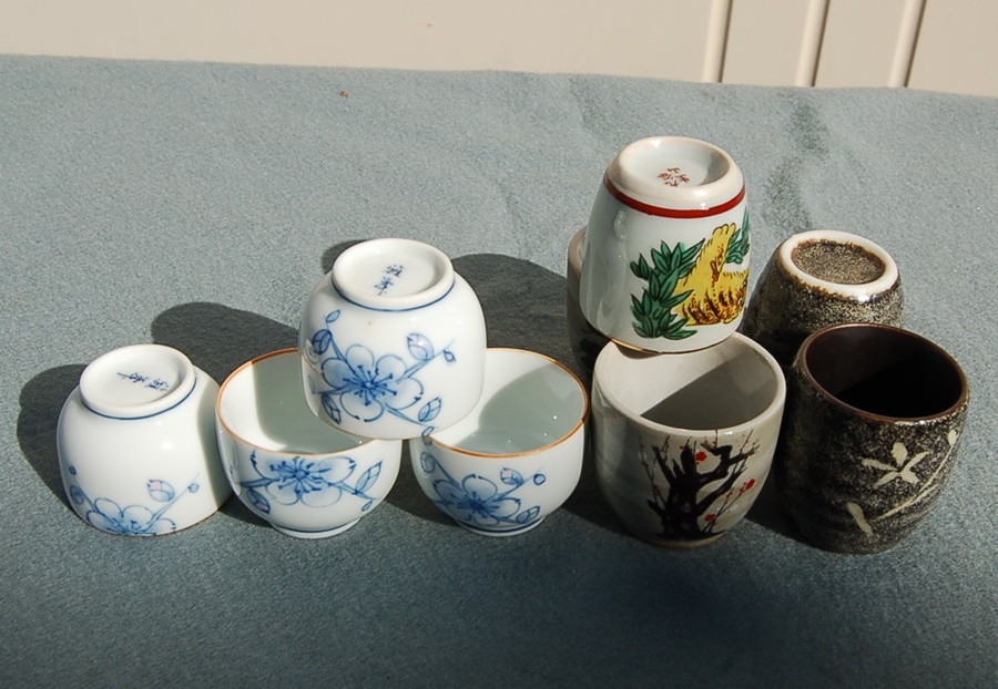 9個 酒器  ぐい呑み  猪口 黒釉/花文 梅・松 白磁/梅文:雅峯 九谷・虎/生山