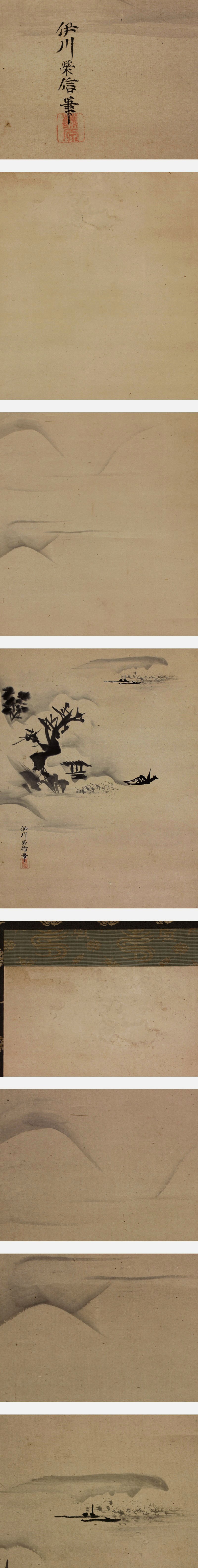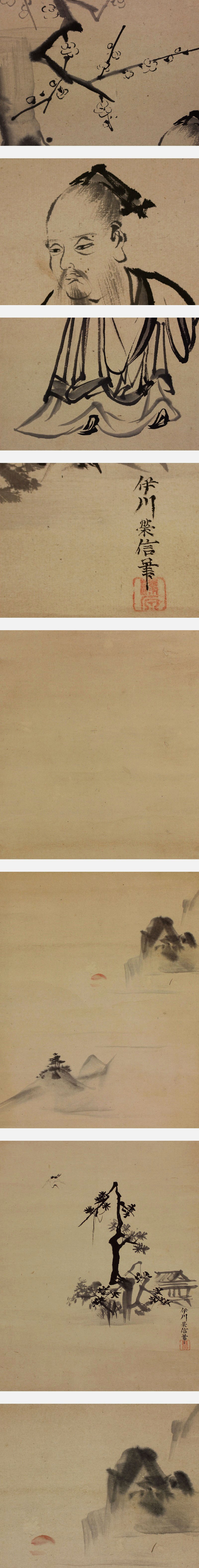 狩野伊川院 江戸後期の画家。養川院惟信の子。名は栄信、号は玄賞斎。絵を父に学び、その父に「吾及ばず」と言わしめた。近世狩野派の名手。水墨に金泥を施す技法に特色を発揮する。また茶道を能くし松平不昧の恩顧を受ける。文化13年法印に叙せられ伊川院と称した。文政11年(1828)歿、54才。 本紙は、染み、折れ、皺、虫食痕があります。 表装は、染み、汚れ、折れ、皺、くすみ、ヤケ、虫食、吊り金具に錆があります。 【サイズ】 作品 横約26cm×縦約93cm 表装 横約38cm×縦約181cm |