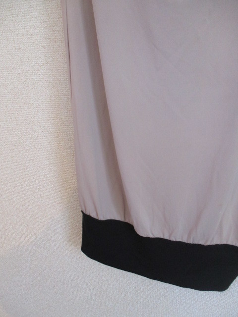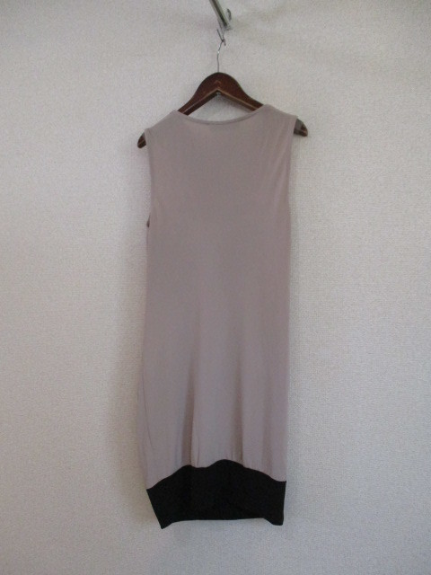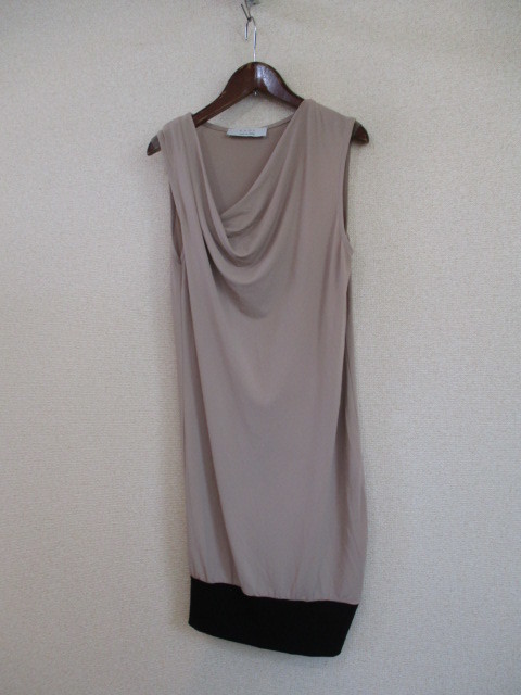 | 商品紹介 | クロスした襟元がポイントのノースリーブワンピースです。 本体のほとんどはベージュで裾は黒です。 生地の切替え部分で少しすぼまった形になっています。 薄手のジャージのような素材で伸縮性があります。 《素材》 アセテート70% ナイロン20% ポリウレタン10% |