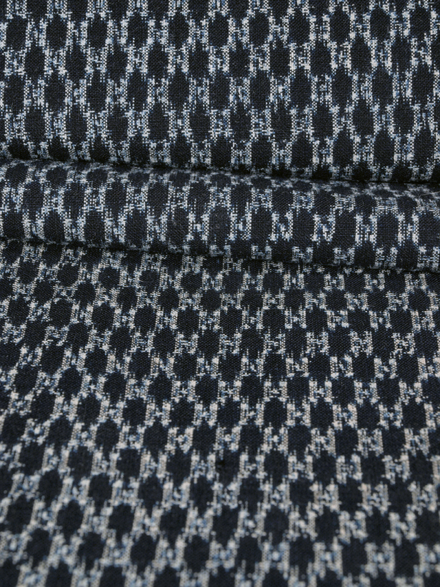 濃藍(こいあい)の地に絣で蜀江錦の文様が織り込まれた、綿絣のはぎれです。 昭和初期ごろにつくられたと思われるアンティークのお品です。ところどころにうっすらとした黄変が広めにありますが、そのほかに目につく大きなしみやよごれなどのダメージはありません。洗い張り済みなので、気持ち良くお使いいただけます。※風楽の出品内で同じ柄のものを複数出品している場合もあります。 |