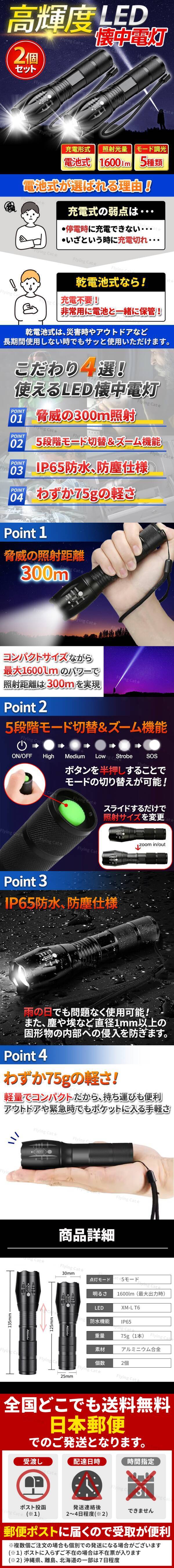 | ・数量:2本 ・サイズ:全長13~14.5cm x直径3.7cm ・重量:110g ・素材:アルミニウム合金 ・LED:XM-L T6 ・明るさ:1600lm(最大出力時) ・照射距離:最長約300m ・点灯パターン:5モード ・防水機能:IP65 ・電源:単4電池×3個(別売り) |