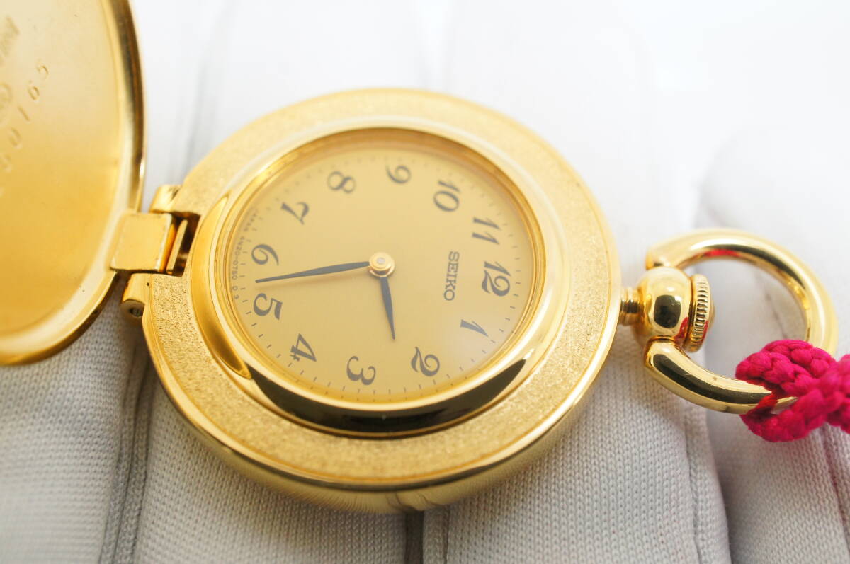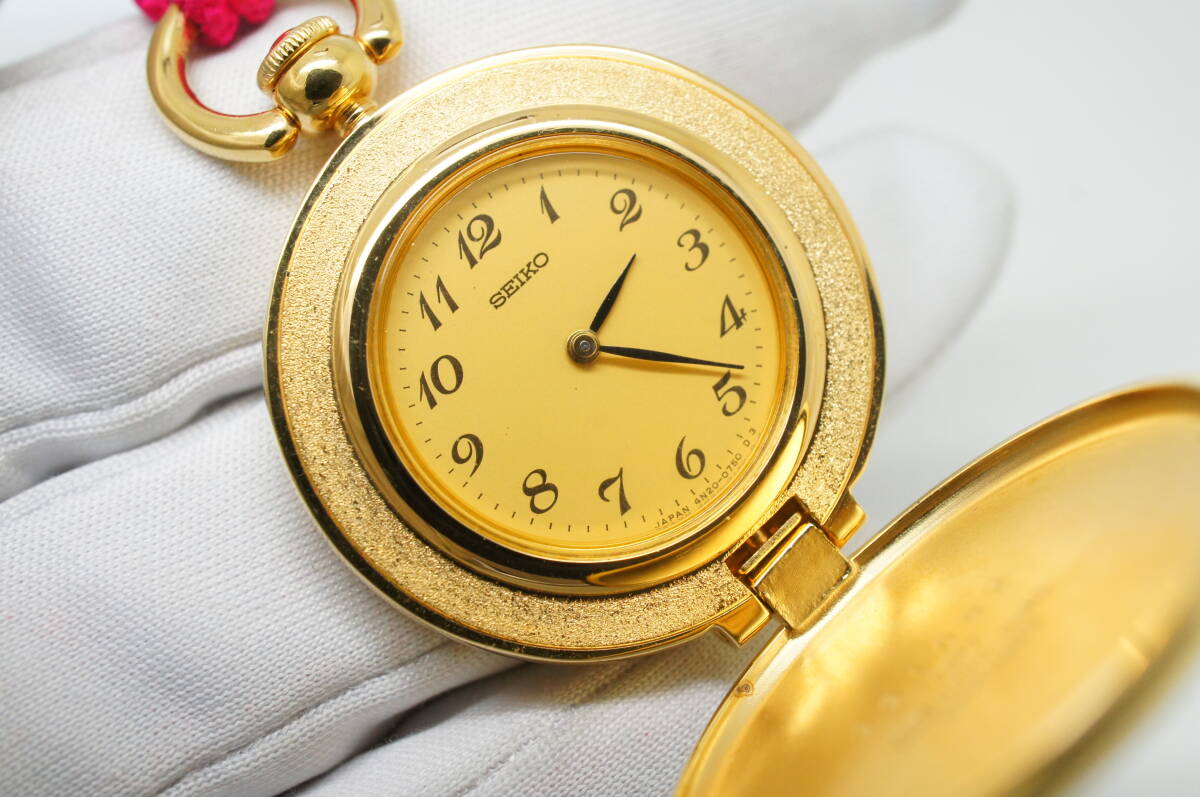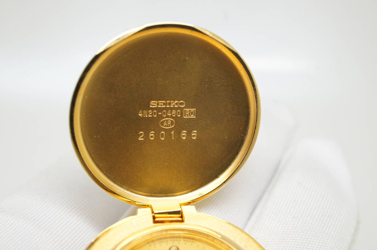 J98●作動良好 SEIKO セイコー 懐中時計 和装時計 4N20-0460 金文字盤 全アラビア数字 ゴールド金 ポケットウォッチ お洒落 クォーツ
