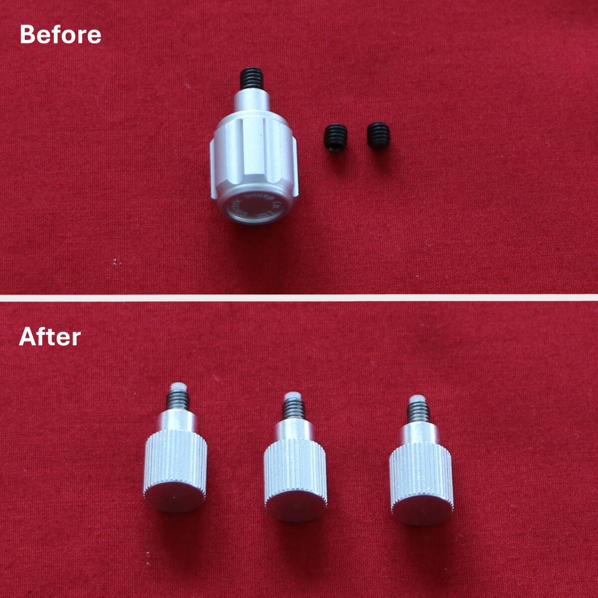 工具レスで操作・調整できるように、イモネジ2個とローレットネジ1個(画像4上段)をPOM樹脂チップ付きのローレットネジ3個(画像4下段)に交換しました。