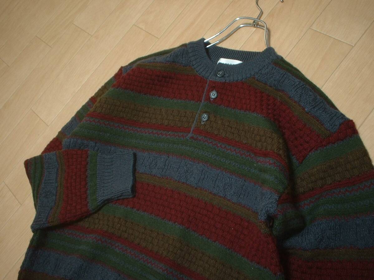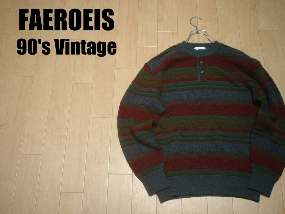 90sビンテージFAEROEISフェアアイルボーダー柄ウールセーターMジャガードヘンリーネックネイティブノルディックアンティークジャミーソンズ