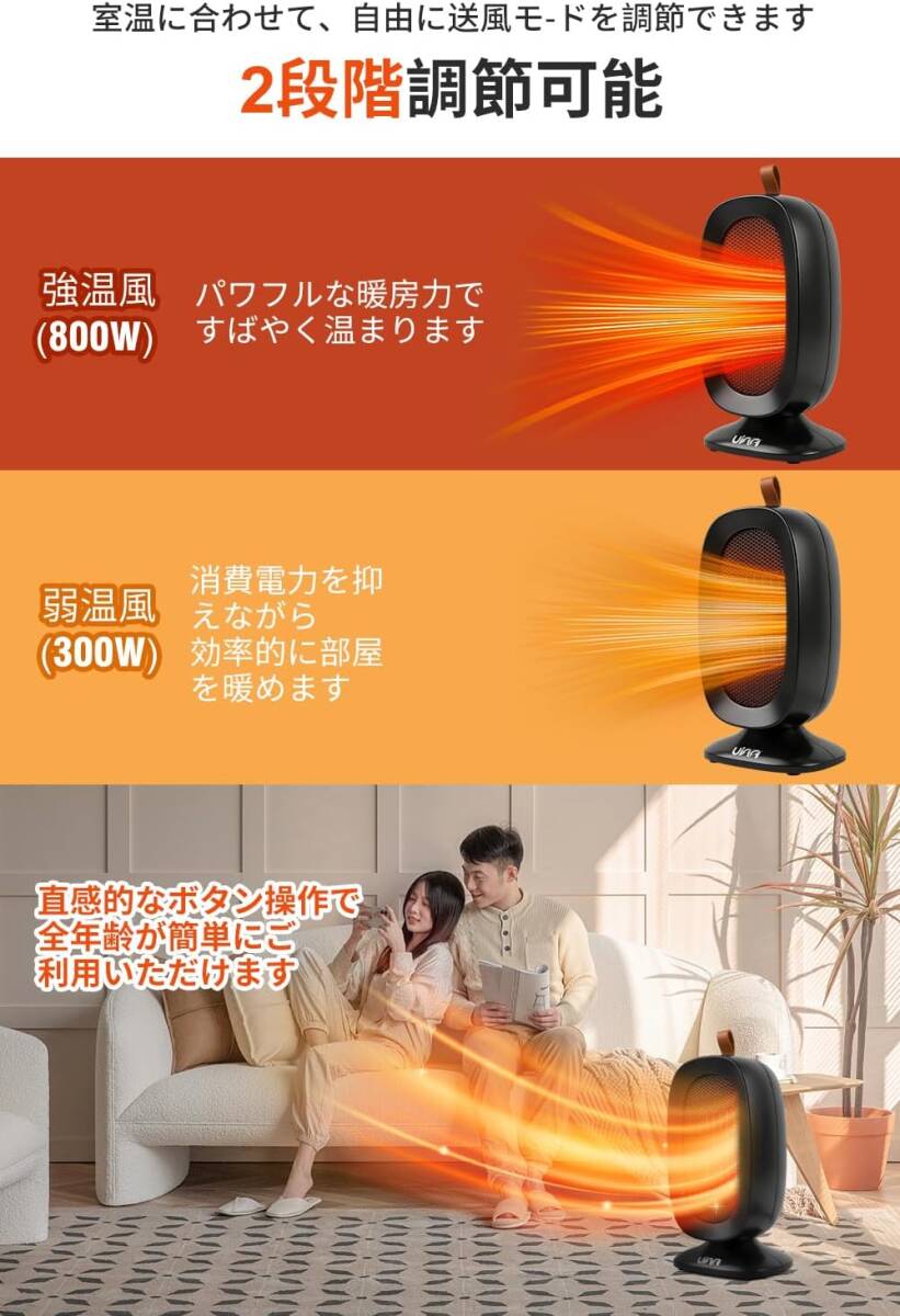 【2段階切替可能】新モデルセラミックファンヒーターは「強温風800W」、「弱温風300W」、2つの温度モードが搭載されます。室内が暖かくなるまでは強温風、部屋が温まったら弱温風に切り替えて使用することで無駄な電力をセーブし、省エネとは一方で環境にも優しい。