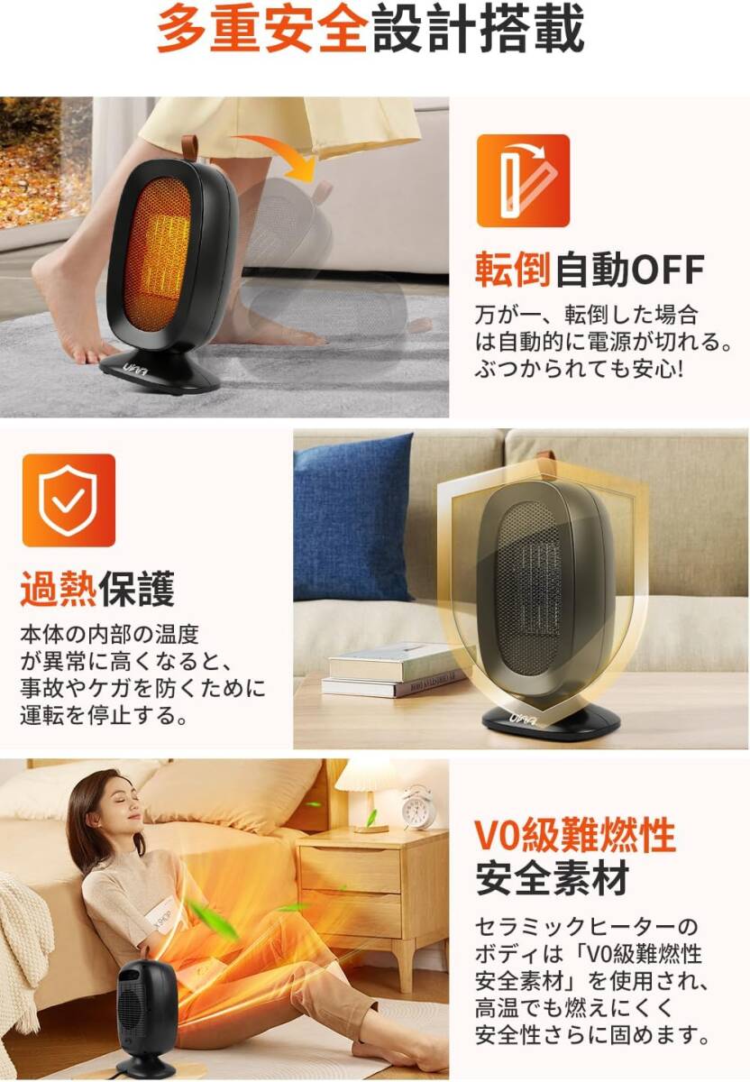 【V0級難燃性安全素材】セラミックヒーターのボディは「V0級難燃性安全素材」を使用され、高温でも燃えにくく安全性さらに固めます。※この製品は日本国内電気用品安全法(PSE)認証済です。