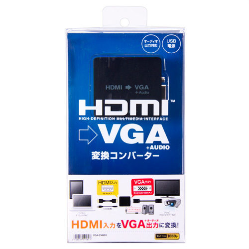 ※配送の送り主はサンワサプライ(株)と記載されています。沖縄・離島配送不可となります。 当店は正規販売代理店です。 特長 HDMI信号をミニD-sub15pinアナログ信号(VGA)に変換するアダプタです。 パソコンやタブレットからのHDMI出力をVGA入力のプロジェクターやテレビなどに出力することができます。 HDMI信号に含まれるデジタル音声から3.5mmステレオアナログ音声信号に変換して出力することもできます。 USB給電で動作するUSBバスパワー方式なのでモバイル環境でも設置が簡単に行えます。 ドライバなどのインストールは必要ありません。接続するだけで使用できます。 HDCP(High-bandwidth Digital Content Protection)に対応しています。 メーカー保証期間180日 ※当店発注日からになります。 気をつけておりますが、タイミングによっては在庫切れの場合があります。 ※機器によってはHDMI機器からのHDMI給電のみで本製品を動作させることも可能ですが、動作保証はできません。安定動作のためには、付属のUSBケーブルによる給電をおすすめします。 ※DVDプレーヤー、Blu-rayプレーヤー、書画カメラなどのHDMI出力機器の場合、映像出力の解像度・設定が正常に出力されないことがあります。各機器の映像出力の設定をご確認して、出力先テレビ・プロジェクターに適した解像度・映像設定に、設定してください。全てのHDMI機器には対応しておりませんので、あらかじめご了承ください。 <ご注意> ※液晶テレビ、プロジェクター、パソコン用ディスプレイも下記解像度・リフレッシュレートに対応している必要があります。 ※解像度1920×1200ドット(WUXGA)には対応していません。 ※下記対応解像度でもリフレッシュレートが異なると正常に表示できないのでご注意ください。 ※パソコン、タブレット以外のHDMI信号入力は正常に出力されない場合があります。(DVDプレーヤー、Blu-rayプレーヤーなど) ※HDMI信号からアナログVGA信号への信号変換の際にタイミングがずれることで上下左右に黒枠が出る場合があります。 ※全ての機器で動作を保証するものではありません。 仕様