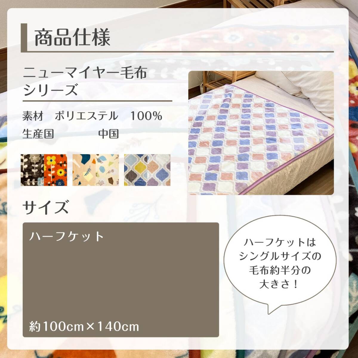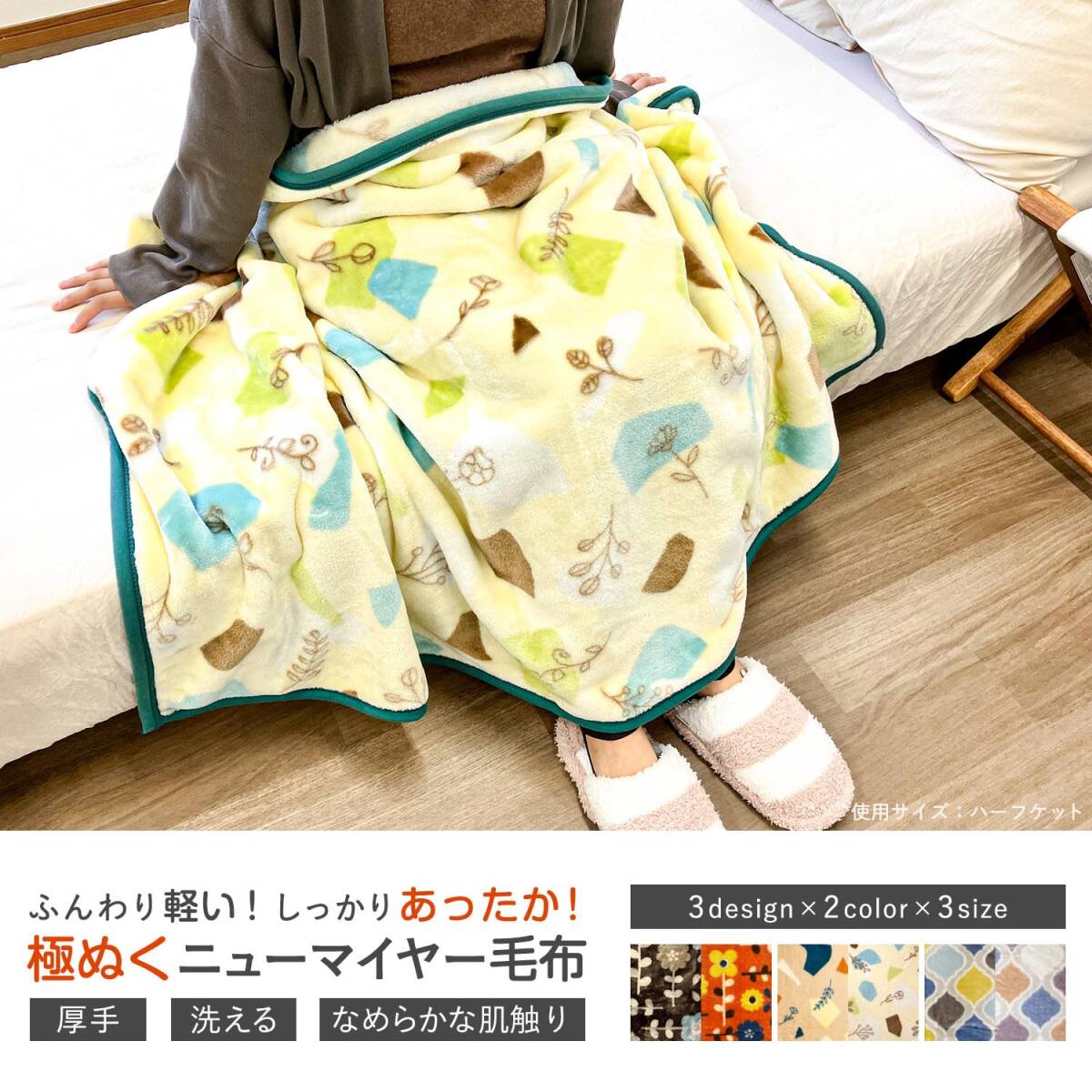 ・【商品名】極ぬく! ニューマイヤーシリーズ 【商品サイズ】ひざ掛け 約70cm×100cm ハーフケット 約100cm×140cm シングル毛布 約140cm×200cm 【カラー】ブラウン オレンジ グレー パープル グリーン 【素材】ポリエステル100% 【生産地】中国(日本企画品)