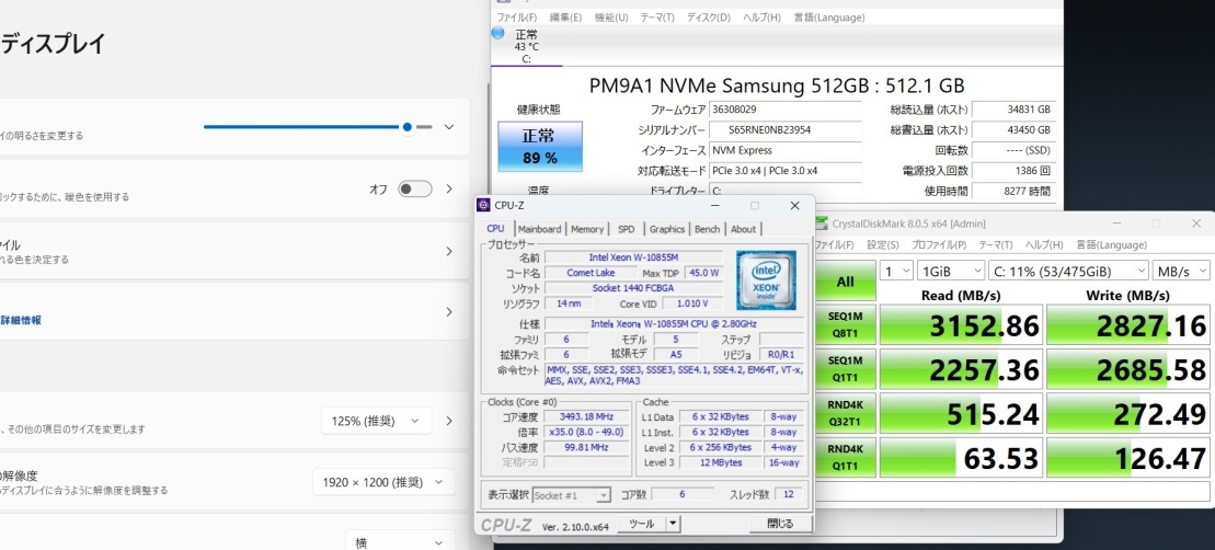 | CPU: 超高速 Intel Xeon W-10855M 2.8Ghz、 6コア12スレッド (ターボ・ブースト利用時の最大周波数 5.1GHz) |