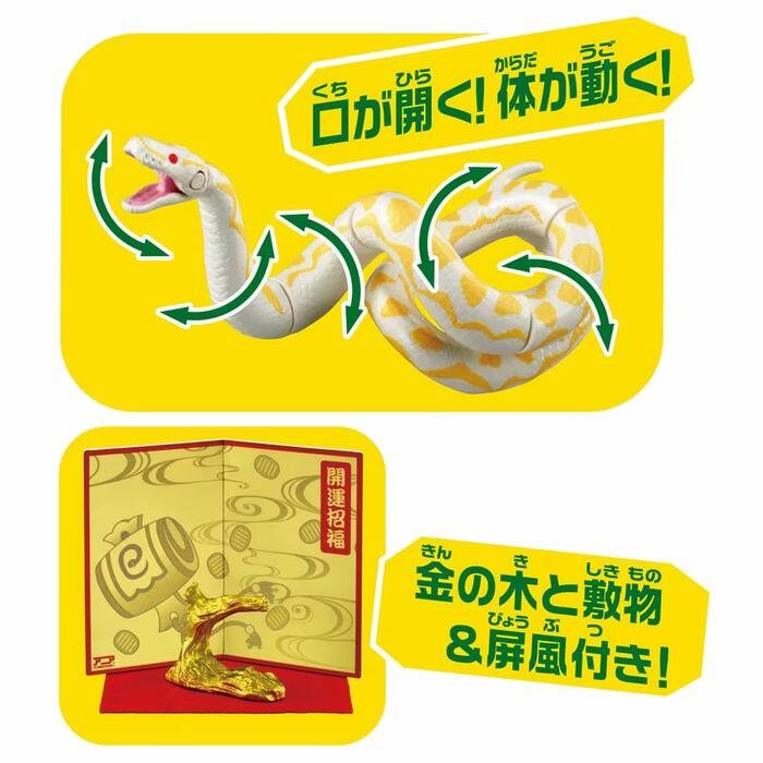 | 特徴 | 手のひらサイズの動かして遊べる動物フィギュア「アニア」から、2025年の干支仕様の「巳(ヘビ)」が登場! 2025年の干支は巳! 白蛇をイメージしたアニアは口、体の4か所の関節が動きます。 付属の金の木に取り付けて飾ることができます。 屏風、敷物付き。 お年賀などのギフトにも最適です。 |