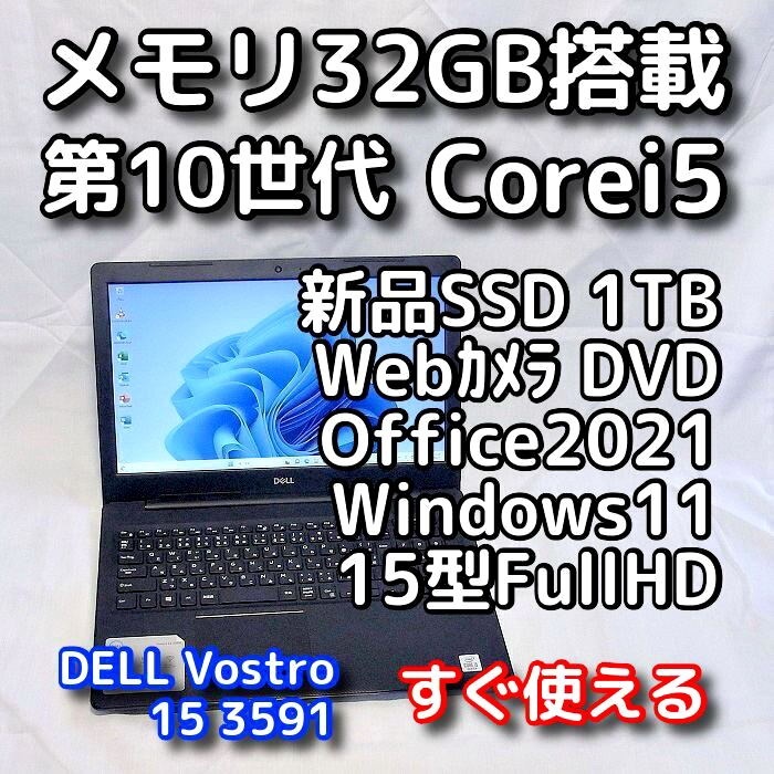 DELL/15.6型FullHD/第10世代 Corei5/メモリ32GB/新品SSD1TB/Windows11(24h2)/Office2021/ノートパソコン/オフィス付き/Vostro 3591