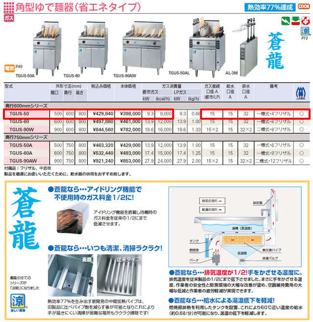 タニコー ガス角型ゆで麺機 蒼龍 TGUS-50 を出品いたします。 ■特徴■ アイドリング機能で不使用時のガス料金1/2に! アイドリング機能を搭載し 待機時のガス料金を 従来の1/2にまで低減させます。 いつも清潔、清掃ラクラク! 熱効率77%を生み出す 新開発の中間加熱パイプは、 旧製品に比べパイプ数を減らす事が可能とんり これにより手が届きにくい清掃が困難な場所も ラクラク掃除で! 排気温度が1/2!手をかざせる温度に。 排気温度を従来製品の1/2にまで低下させました。 まさに手をかざせる温度。 作業者の安全性と厨房環境の大幅な改善が望め、 空調維持費用の大幅な低減と 作業者の疲労軽減が実現できます。 給水による湯温低下を軽減! 燃焼部排熱を利用したタンクを設置、 これにより60℃近い温度の 給水(約0.6L/分)が可能になり、 湯温の低下を軽減します。 ■仕様■