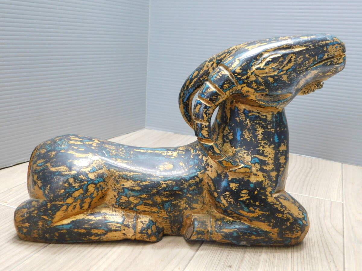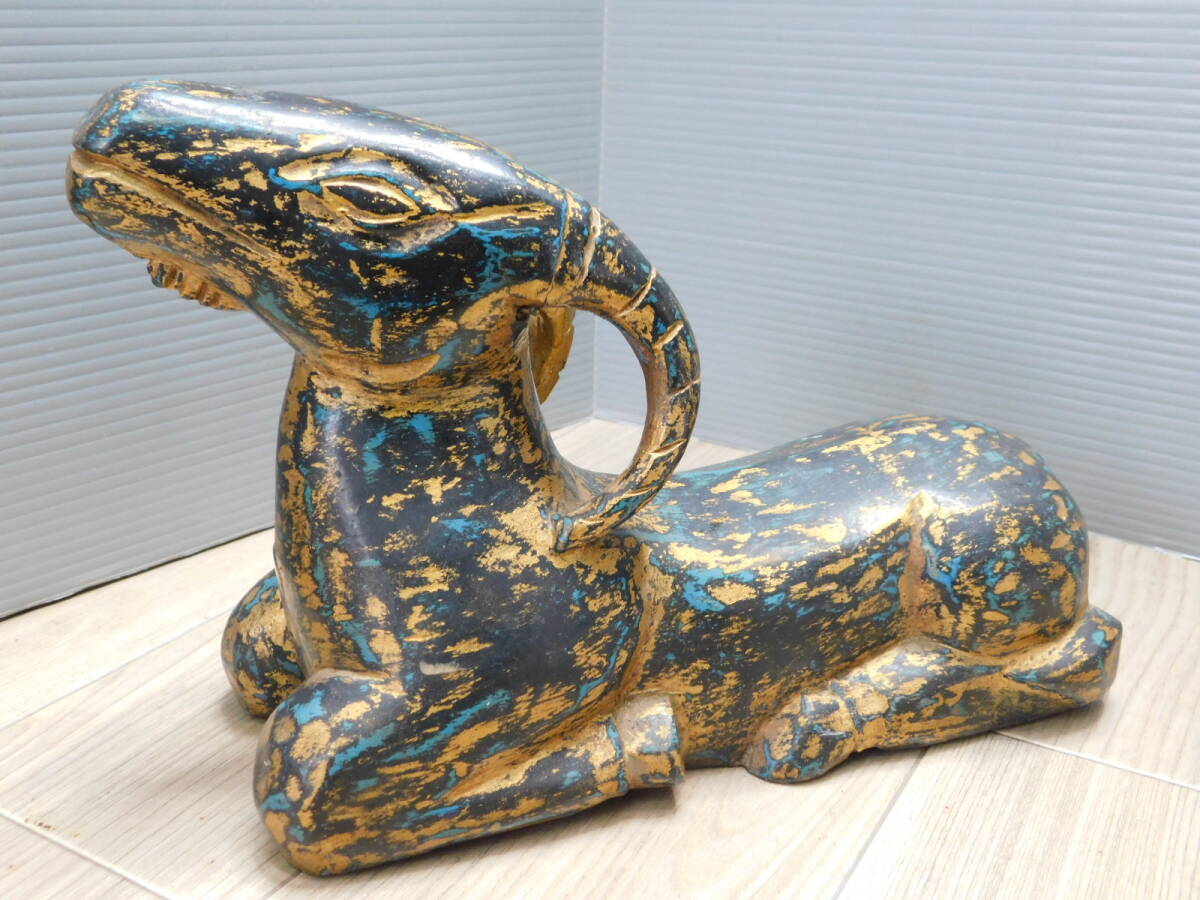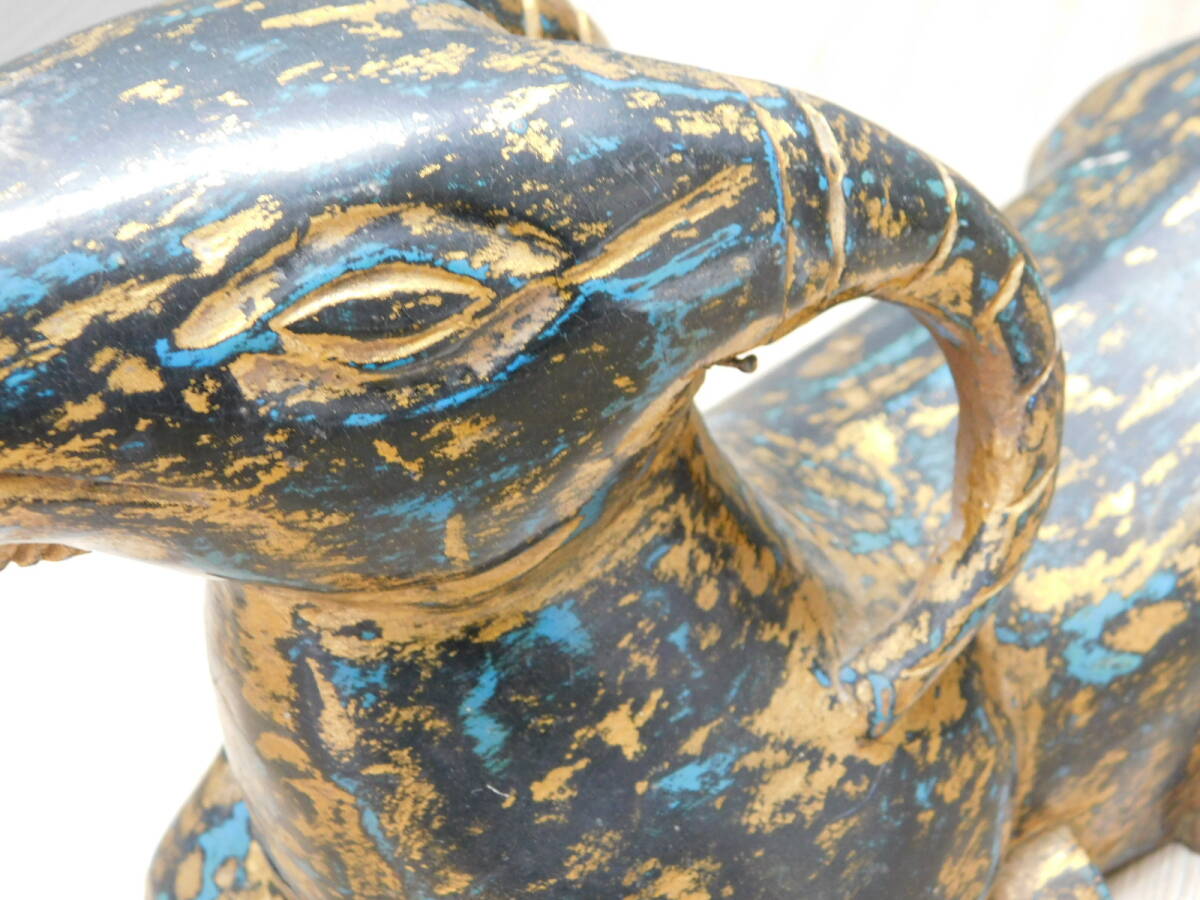 【リアルアンティーク】木彫 山羊 GOAT 金黒青 古美術品 オブジェ 置物/M409