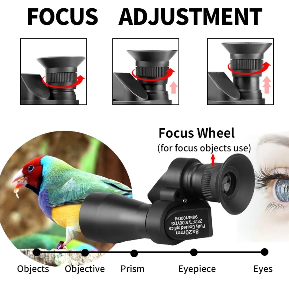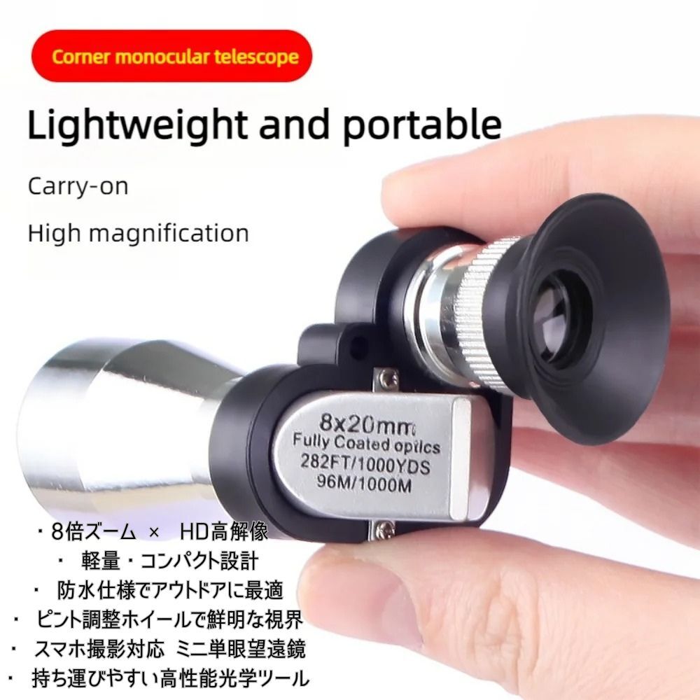 軽量・高倍率設計の 8x20mm ミニ単眼望遠鏡。 手のひらサイズのコンパクトボディながら、遠距離でも鮮明な映像を提供します。 アウトドア、登山、釣り、コンサートなど、あらゆるシーンで持ち運びやすく快適に使用できます。 スマートフォン接続にも対応し、写真撮影や動画撮影にも活用可能です。 ■ 特徴 ・ 高倍率 8倍ズーム 遠くの対象を鮮明に捉え、安定した視野を実現。 ・ HD高解像度レンズ フルコーティング光学ガラスにより、色再現性が高く、クリアで明るい映像を再現。 ・ ピント調整機構付き 接眼部のフォーカスホイールでスムーズに焦点を合わせられます。 ・ 金属ボディ採用 耐久性のあるメタル素材で、屋外での使用にも安心。 ・ 防水性能(IPX4) 軽い雨や湿気に強く、アウトドアや釣り、ハイキングにも最適。 ・ 多用途対応 スマートフォンホルダー・三脚との併用で撮影にも活用可能。 ■ 仕様 ・ 倍率:8倍 ・ 対物レンズ径:20mm ・ 実視界:96m/1000m ・ コーティング:フルマルチコート(Fully Coated Optics) ・ フォーカスタイプ:手動フォーカス(接眼側) ・ 材質:金属+ABS樹脂 ・ 防水性能:IPX4 ・ サイズ:約95×40×60mm ・ 重量:約120g ■ 付属品 ・ 専用収納ポーチ ・ クリーニングクロス ・ ハンドストラップ ・ スマートフォンホルダー ・ ミニ三脚(セットモデルのみ) ・ 取扱説明書(英語) ■ 使用シーン ・ 登山・キャンプ・ハイキング ・ バードウォッチング・自然観察 ・ コンサート・スポーツ観戦 ・ 旅行・観光・風景撮影 ・ 釣り・狩猟・監視用途 |