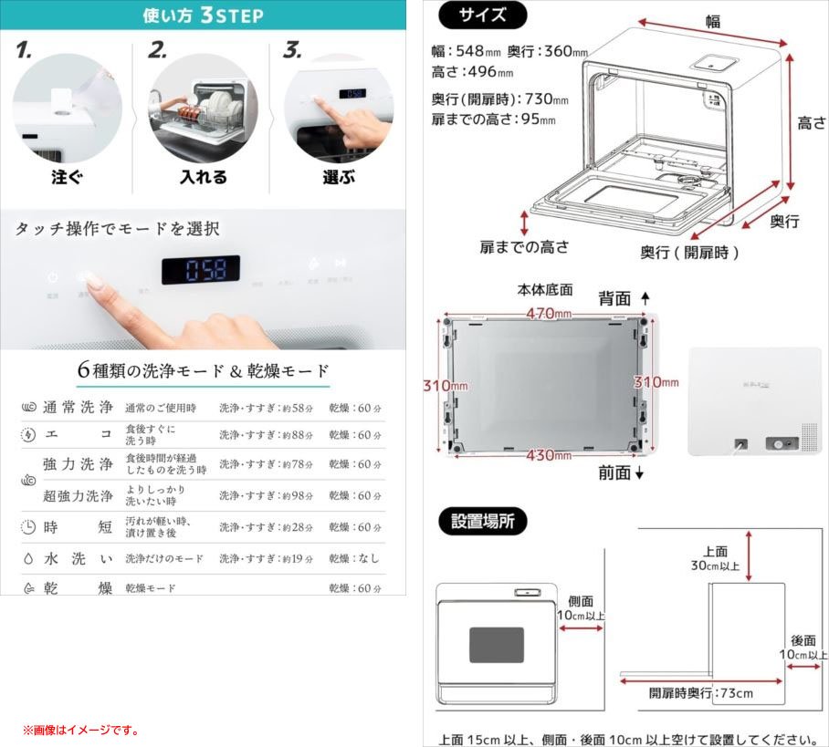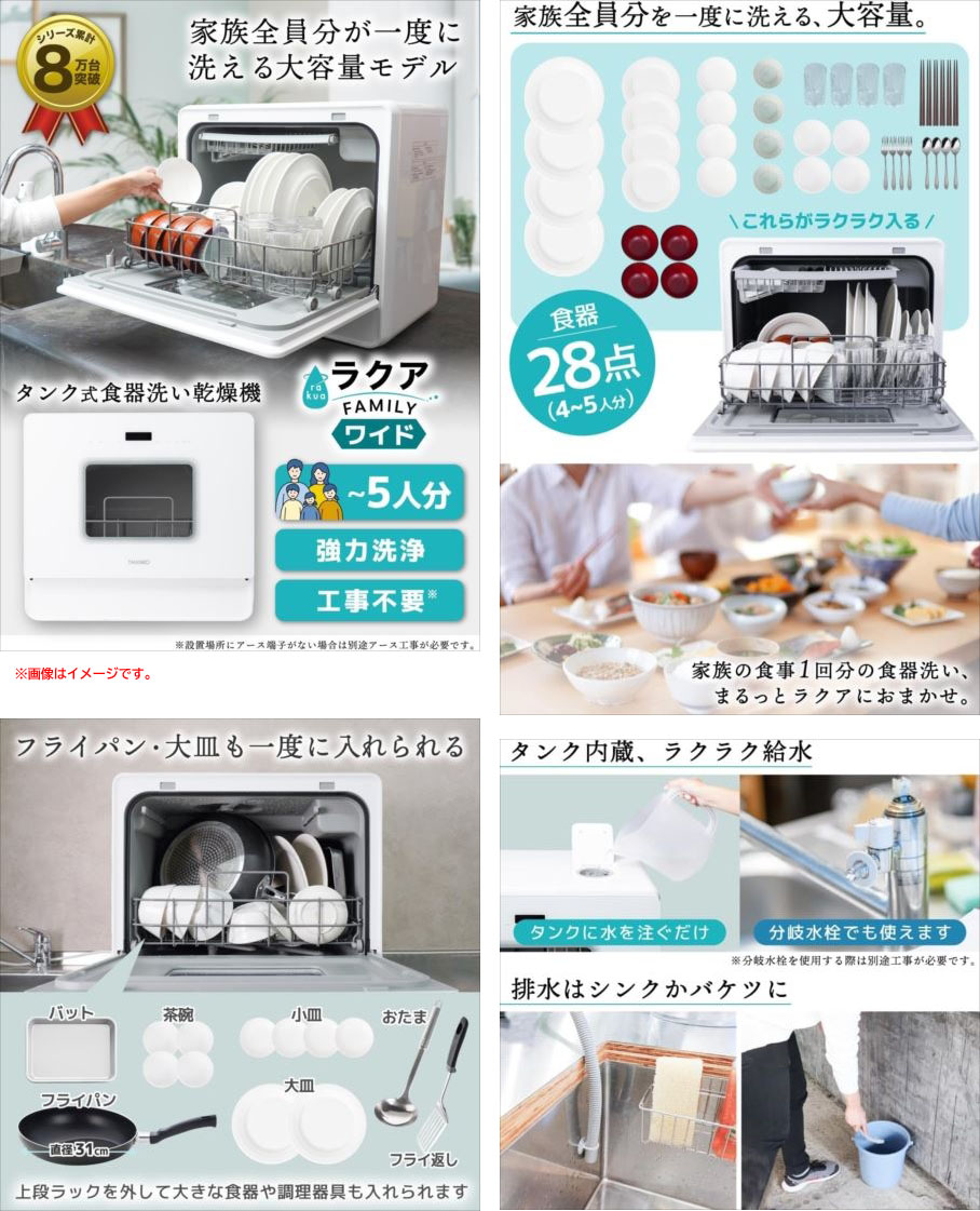 【商品特長】 ◆家族全員分が、まるっと洗える大容量サイズの食器洗い乾燥機が登場しました。 大きくなっても洗浄力はそのまま。 上下3つのノズルから出る熱水で、食器をしっかりと洗います。 食事後の食器洗いは食洗機「ラクア ファミリー」に任せて、家族との時間を増やしませんか? ◆ 食器は最大28点(およそ4~5人分)入る大容量! 家族の食事一回分の食器洗いができちゃいます。 上部のトレイを外せば、大きな調理器具や最大28cmまでの大皿も入れられます。 ◆洗浄力のポイントは3つ。 ・設置されている3つのノズルで上下様々な角度から水が食器に当たる。 ・手洗いでは難しい最高75度(※)の熱水での洗浄で、油汚れも落ちやすく。 ・ノズルから出る高圧の水が、食器をしっかりと洗い流す。 ※最高75度になるのは強力洗浄モードの時。 洗浄後は、温風乾燥に自動で切り替わり。 食器の乾燥の役割までしっかりと果たします。 ◆設置工事・水道工事不要 「ラクア ファミリーワイド」は、置くだけの簡単設置。 設置工事などは不要で、届いたらすぐに使えます。 ※設置場所にアース端子がない場合は別途アース工事が必要です。 タンクへの給水式なので、水道工事も要りません。 ※別途水道工事をして分岐水栓での使用も可能 排水先はシンクかバケツのどちらでもOK。設置場所に合わせて選択できます。 | |||||||||||||||||||||||||||||
