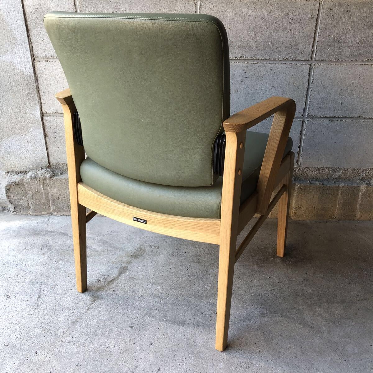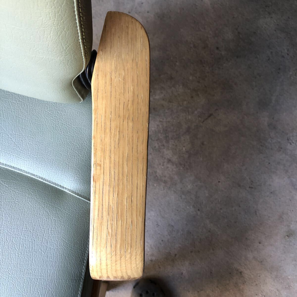 落ち着いたペールグリーン色の肘付きが浅いチェアです。肘付きが立ち上がりをサポートしてくれます。